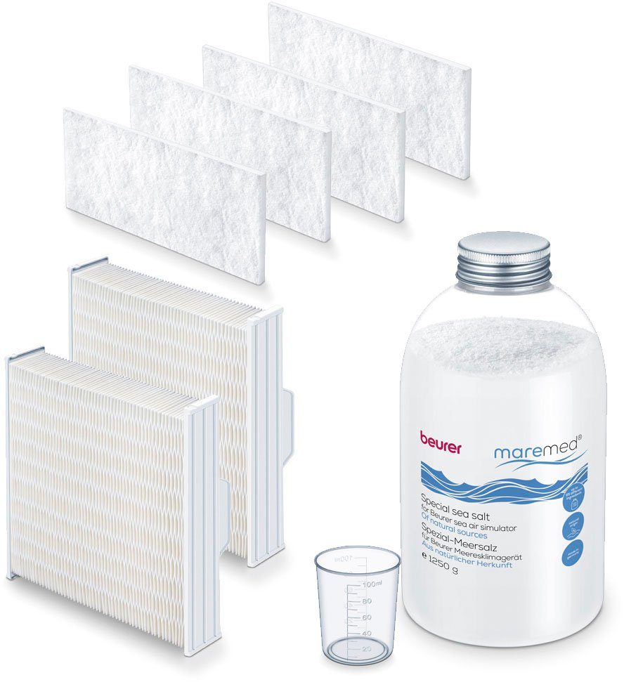 Lieferumfang | 1x Flasche Spezial-Meersalz (1250g) inkl. Messbecher, 4x Vorfilter, 2x Wasserverdunsterblock |