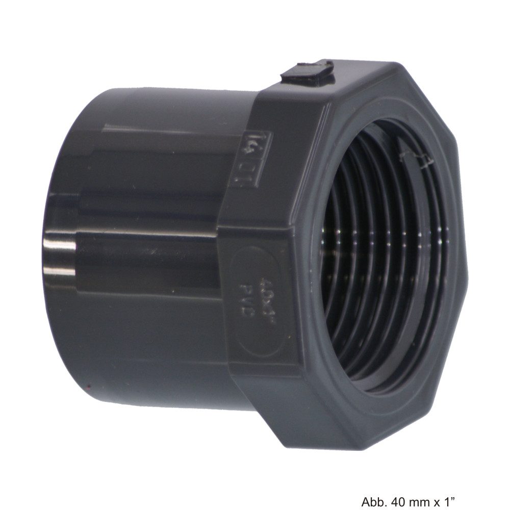 PVC-U Reduzierstück mit Achtkant, Klebestutzen x IG, 10 bar, 25 mm x 1/2" - Eigenschaften: Werkstoff: PVC-U (PVC-hart) = Polyvinylchlorid, entsprechend dem Standard für Druckleitungen aus PVC-hart. Farbe: grau. Die Verbindung erfolgt nach DIN 8063 bzw. EN 1452 mittels kalibrierloser Klebverbindung. Betriebsdruck: Richtwert für Kleb- und Übergangsfittings: PN 16 = 16 bar bei 20°C (Wasser) Richtwert für Übergangs- und Gewindefittings, Verschraubungen: Anwendungsbeispiele: Abwasserneutralisation, Apparate- und Anlagenbau, Autowaschanlagen, Chemische Industrie, Fischindustrie, Foto- und Filmindustrie, Galvanotechnik, Gewächshäuser, Schwimmbadbau, Kläranlagen, Pharmazeutische Industrie, Trinkwasser, Wasseraufbereitung, Schiffsbau u.v.m. Fittings aus PVC-U weisen generell alle Vorteile auf, die sich seit Jahrzehnten in allen Bereichen der Industrie und Installationstechnik bewährt haben. Vor allem die ausgezeichnete chemische Beständigkeit bietet die Gewähr für eine langlebige Gebrauchsdauer. PVC10879