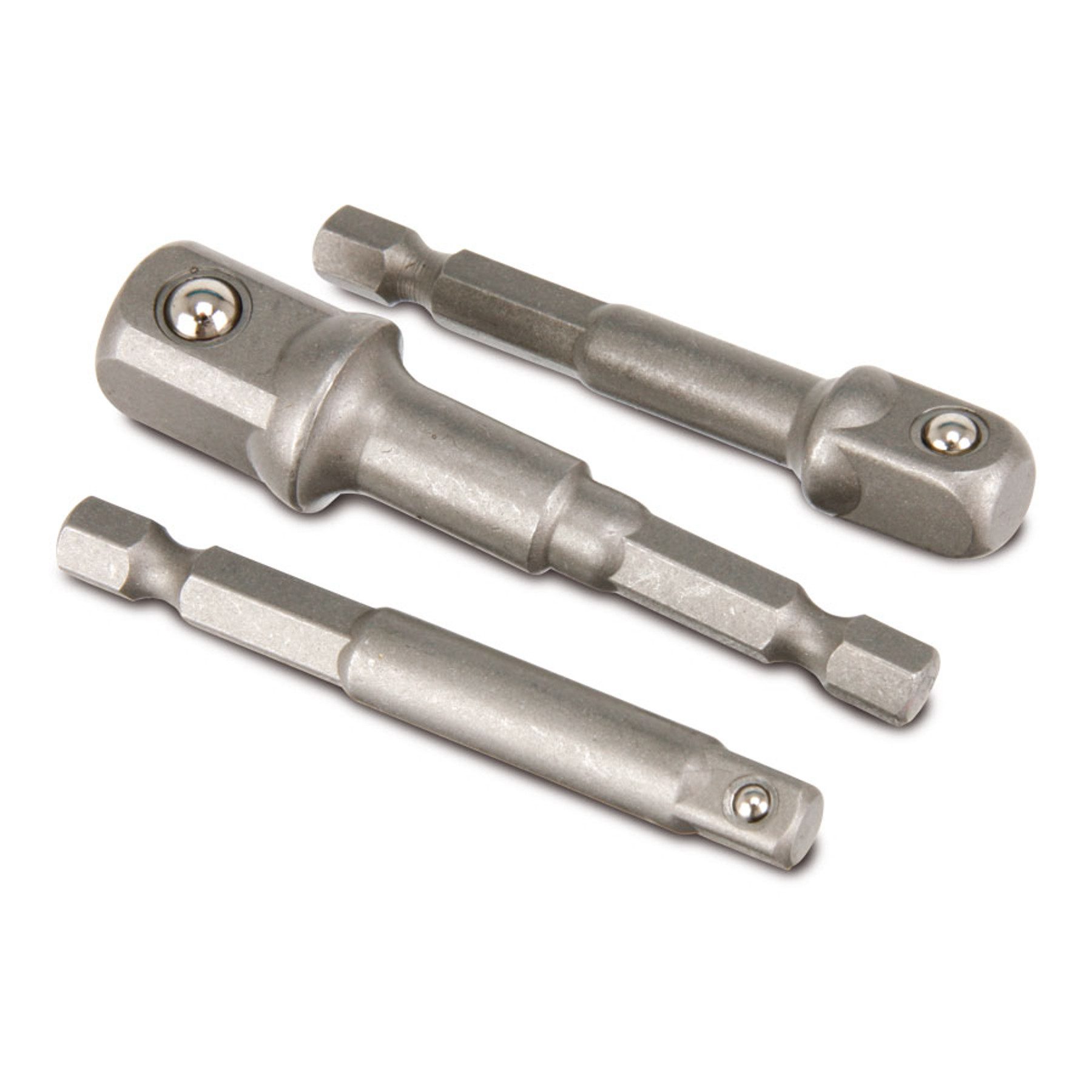 Mit diesen Adaptern aus Chrom-Vanadium können Sie Ihre vorhandenen Steckschlüssel-Einsätze in Akkuschraubern oder Bohrmaschinen benutzen. 3 Adapter für alle gängigen Nüsse (6,35 mm (¼", 65 mm), 9,5 mm (3/8", 65 mm), 12,7 mm (½", 75 mm)).