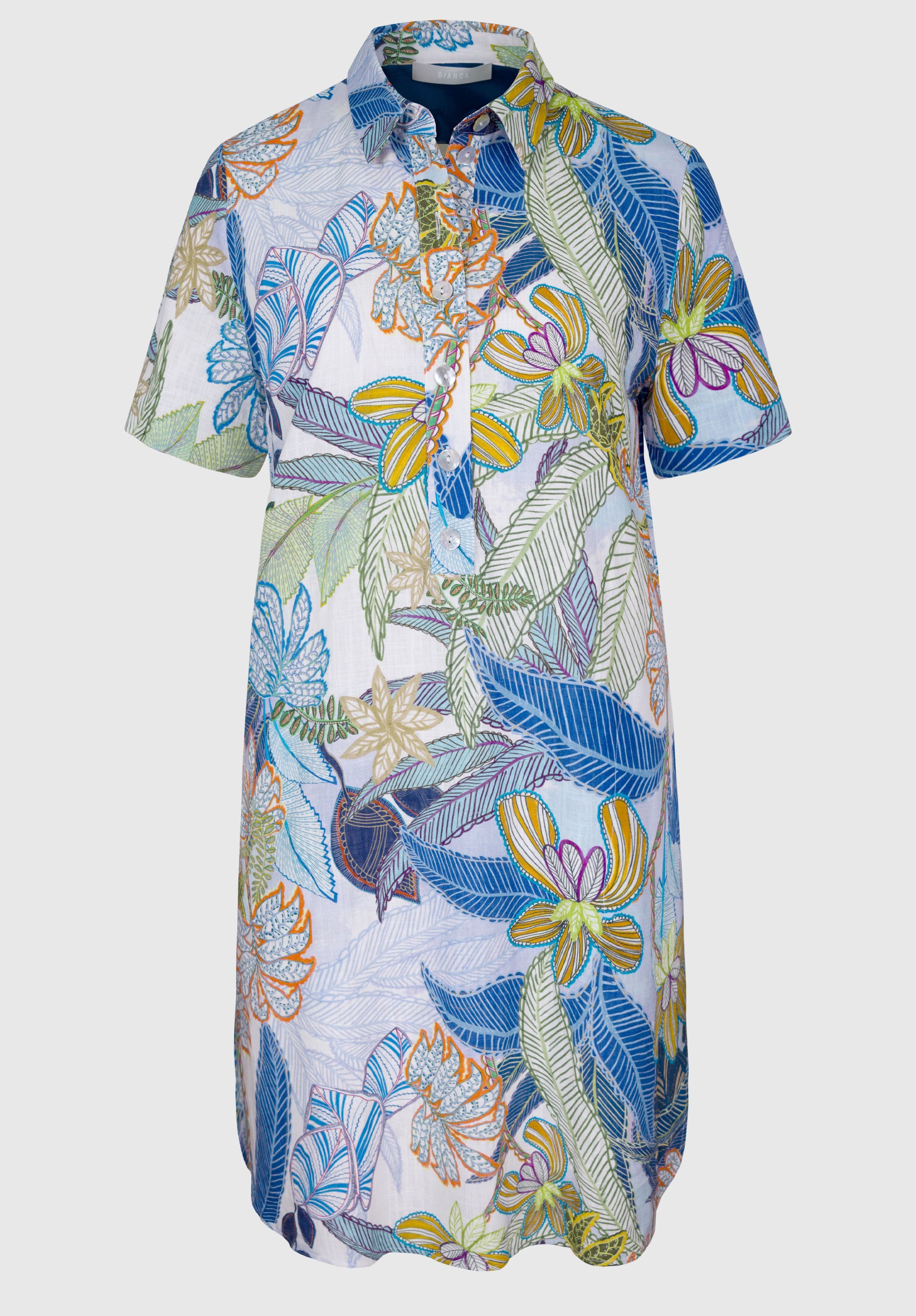Unser neues Hemdblusenkleid Anina aus hochwertiger Viskose mit Leinen überzeugt mit einem schönen sommerlichen Druck und der locker fallenden Passform, dem Hemdblusenkragen und mit der kurzen Knopfleiste mit ausgesuchten Perlmuttknöpfen. Mit ihren seitlichen Eingrifftaschen und den gerundeten Gehschlitzen seitlich, wird Anina zu einem perfekten Begleiter für viele Anlässe. Style sie ganz sportlich mit Sneakern für den Alltag oder mit schicken Sandaletten für die nächste Sommerparty.