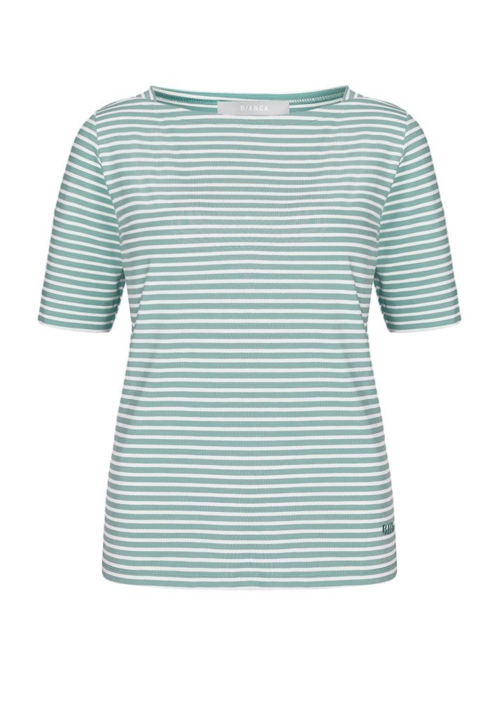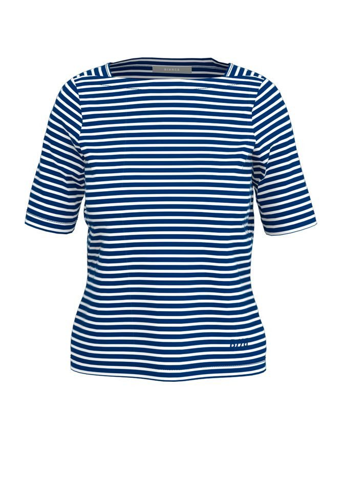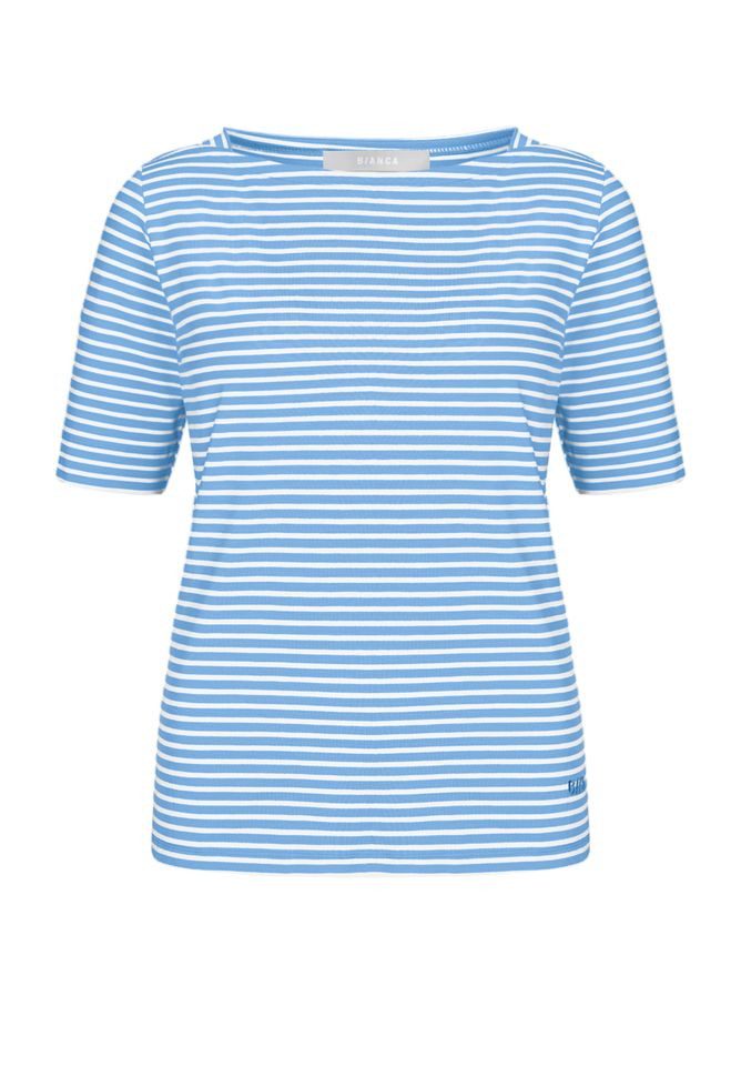 Bianca Damen T-Shirt „Lotti“ überzeugt durch seinen lässigen Streifenlook, eine lockere Passform und einen maritimen U-Boot-Ausschnitt. Das gestreifte Kurzarmshirt ist ein echter Allrounder für den Alltag – stilvoll, unkompliziert und bequem.