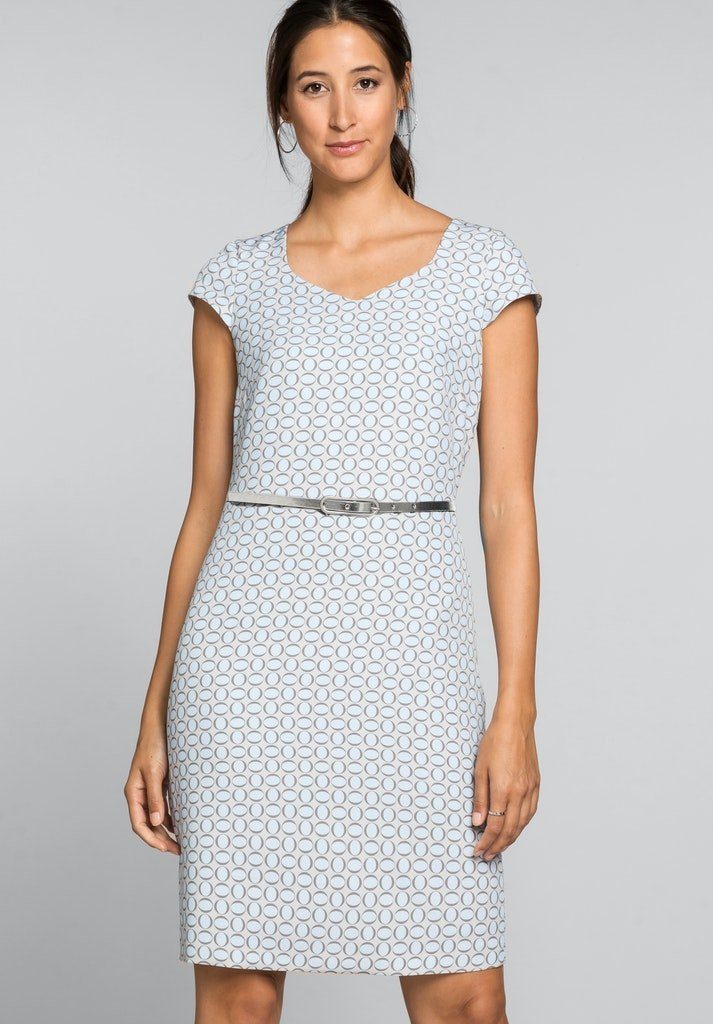 Unser Kleid Didy zaubert durch die gerade Form und mit einem modischen Minimal-Print eine tolle Figur. Durch den stretchigen Elasthananteil ist unser Kleid Didy super bequem. Das gefütterte Etuikleid ist mit einem herzförmigen Ausschnitt, kleinem Gürtel, Cup-Ärmeln und verdecktem Zipper ausgestattet und ist damit ein absolutes Fashion-Item für jeden Anlass. Egal, ob mit dem passenden Blazer Zola im Büro oder feminin mit der kleinen Kleiderjacke Carolin in Farbe silver. Mit dem Kleid Didy bist du stets gut gekleidet.