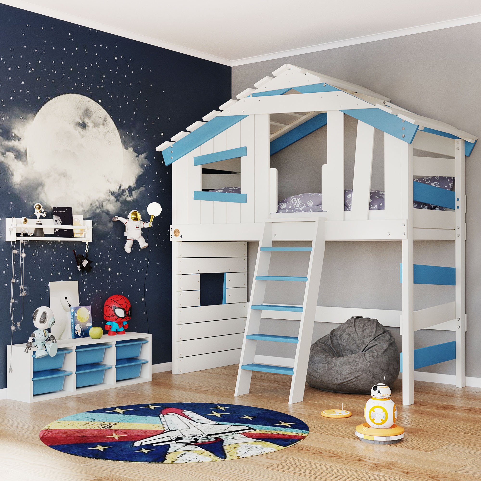 Massive Kiefer, einzigartiges Design und vielfältige Gestaltungsmöglichkeiten - das ist das neue Kinder- und Jugend-Hochbett / Doppelbett von BIBEX® Dieses Markenprodukt ist einzigartig. Sehen Sie sich die vielfältigen Ausführungen vom Kinder- und Jugend-Hochbett der Marke BIBEX an und treffen Sie Ihre Wahl nach Ihren Bedürfnissen und Vorlieben. Kinderhochbett Abmessungen Die Liegefläche beträgt 200 x 90 cm, sodass alle gängigen Matrazzengrößen und Lattenroste verwendet werden können. Die Gesamthöhe beträgt 2.33 m, sodass das Bett in gängige Räume problemlos passt. Die Höhe unterhalb der Liegefläche beträgt ca. 1.1m und bietet damit genügend Platz zum Spielen, oder auch ein zweites Bett (direkt im Angebot zum Auswählen). Werterhalt beim Wiederaufbau Wir sind der Überzeugung, dass jedes Produkt nicht nur langlebig sein soll, sondern auch sein Wert möglichst lange erhalten bleiben muss. Aus diesem Grund haben wir uns bei der Entwicklung für Befestigungsmaterial entschieden, welches Ihnen erlaubt das massive und komplexe Gerüst beliebig viele Male auseinander zu schrauben, und natürlich wieder zusammen zu setzen. Dank Zweikomponenten-Schrauben bleibt das Holz unversehrt und wird dabei nicht beeinträchtigt. Das Bett kann beim Umzug oder auch beim Wiederverkauf problemlos in die einzelnen Komponenten zerlegt werden und an einem anderen Ort wieder zusammengesetzt. Massivholzmöbel kann alt werden Massivholz wird im Gegensatz zu Spanplatten aus vollständigen Holzteilen zusammengesetzt. Das gibt eine stabile, dauerhafte Konstruktion, die man selbst bei Dellen, Rissen oder Kratzern einfach reparieren kann. So können Massivholzmöbel Generationen alt werden. Auch die Abmessungen der einzelnen Teile sprechen für sich. Die Pfosten haben einen Querschnitt von 45 x 75mm, tragende Querstreben sind 130 x 25mm stark und die Verkleidung besteht aus 130 x 18mm starken Brettern. Sicherheit! Abgeschrägte Ecken und Kanten Glatte, geschliffene Oberflächen sehr Stabile Konstruktion, solide Verarbeitung Gitter und Geländer als Absturzsicherung im Schlaf breite Trittflächen mit rutschehemmender Maserung bei den Stufen der Leiter Kaufpreis beinhaltet den Bausatz des Hochbettes mit Leiter. Zusätzlich können 5 weitere Komponenten mitgekauft werden: 1. Unterstellbett (90x200cm) 2. Hängeregal (unterhalb des oberen Bettes, viereckig) 3. Oberregal (unterhalb des Daches, dreieckig) 4. Pforte (Türchen) für das obere Bett 5. Rausfallschutz (für das Unterstellbett) Lattenrost: ist nicht im Lieferumfang enthalten, kann aber bei uns mitbestellt werden. Die Matratze, die Bettwäsche, das Spielzeug und Interieur sind nicht im Lieferumfang enthalten.