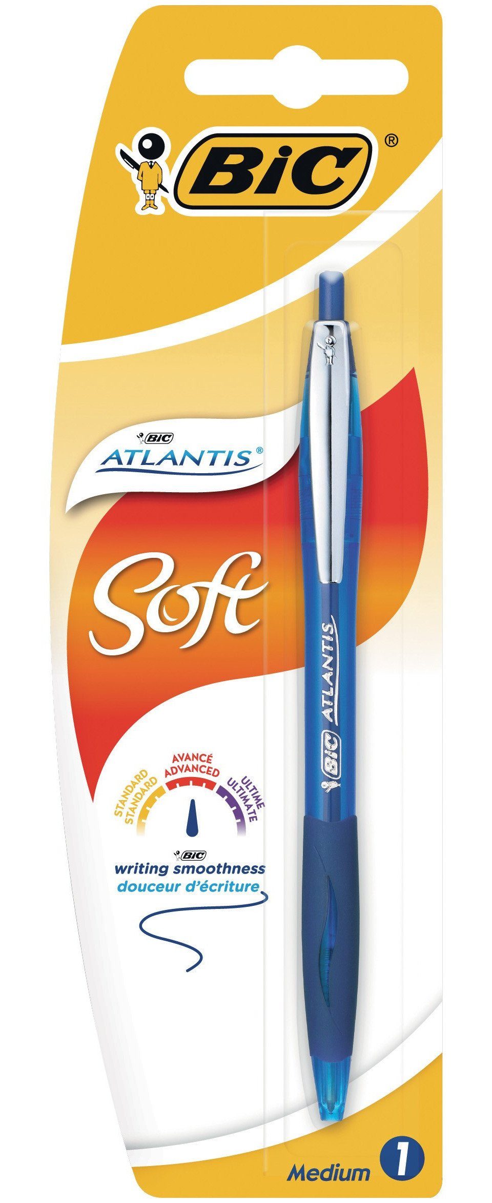 Druckkugelschreiber BIC® ATLANTIS® Soft. Druckmechanik. Typbezeichnung der Mine: refill X-Smooth. Ausführung Mine: 0,4 mm, blau, dokumentenecht, Mine auswechselbar. Ausführung Stift: Kunststoff, gummiert. Ausführung Clip: Metall. X-Smooth Tinte. Farbe des Schaftes: in Schreibfarbe.