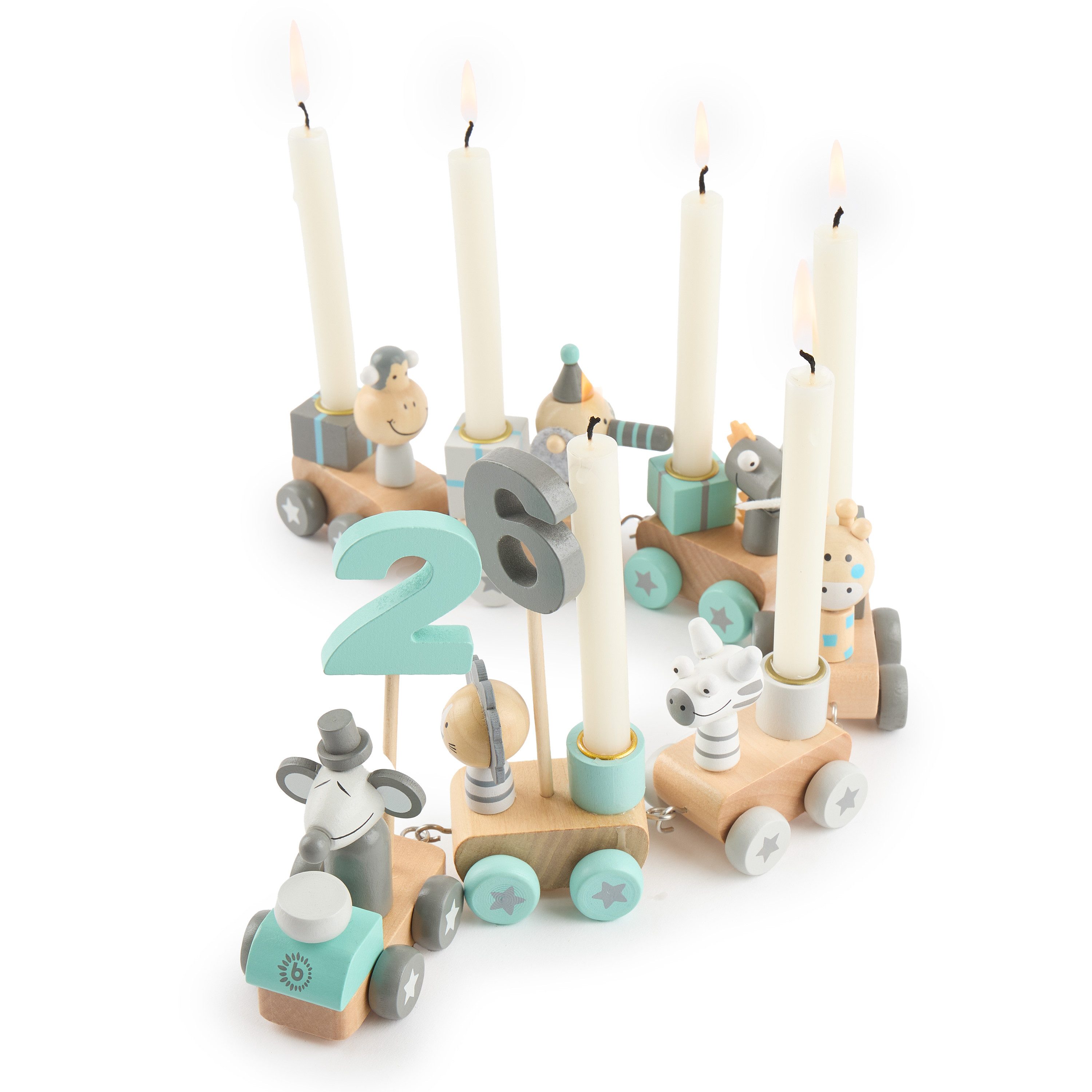 Die Geburtstagskarawane der einzelnen Anhänger können individuell gewählt werden, mit Ausnahme des ersten Tieres des Zugs (Lok). Der Geburtstagszug ist aus Holz gefertigt und besonders hochwertig im harmonisch, modernem Farbdesign. Die Farben sind natürlich auf Wasserbasis und schadstofffrei. Ob 0 oder 99 Jahre, Geburtstagszug Mädchen oder Geburtstagszug Junge - dieser Geburtstagszug Kerzen begleitet Geburtstagsfeiern der ganzen Familie!