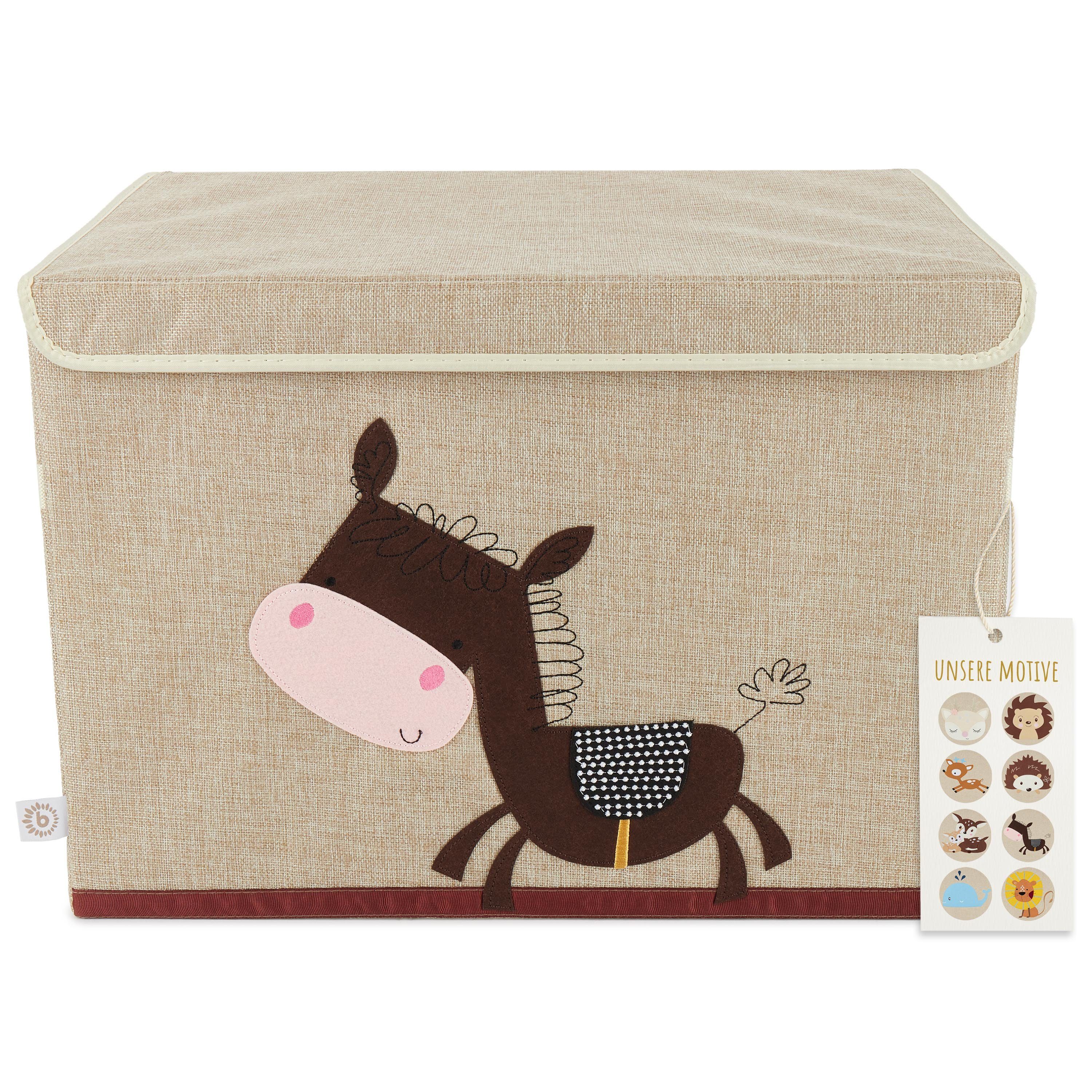 Diese schöne Spielzeugbox von Bieco bringt Ordnung ins Kinderzimmer. Im niedlichen Eselmotiv bereitet sie Kindern und Eltern viel Freude. Die Dekorative Kiste hat einen Deckel zum Aufklappen, der sich mit einem Klettverschluss leicht verschließen lässt. Wird die Aufbewahrungsbox einmal nicht benötigt, kann sie einfach zusammengefaltet werden und verschwindet platzsparend im Schrank. Dank der Tragegriffe an der Seite der Box lässt sie sich spielend einfach transportieren.