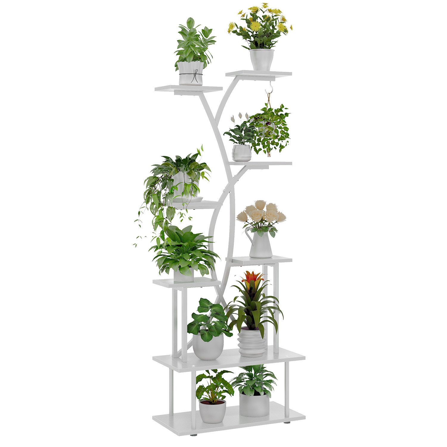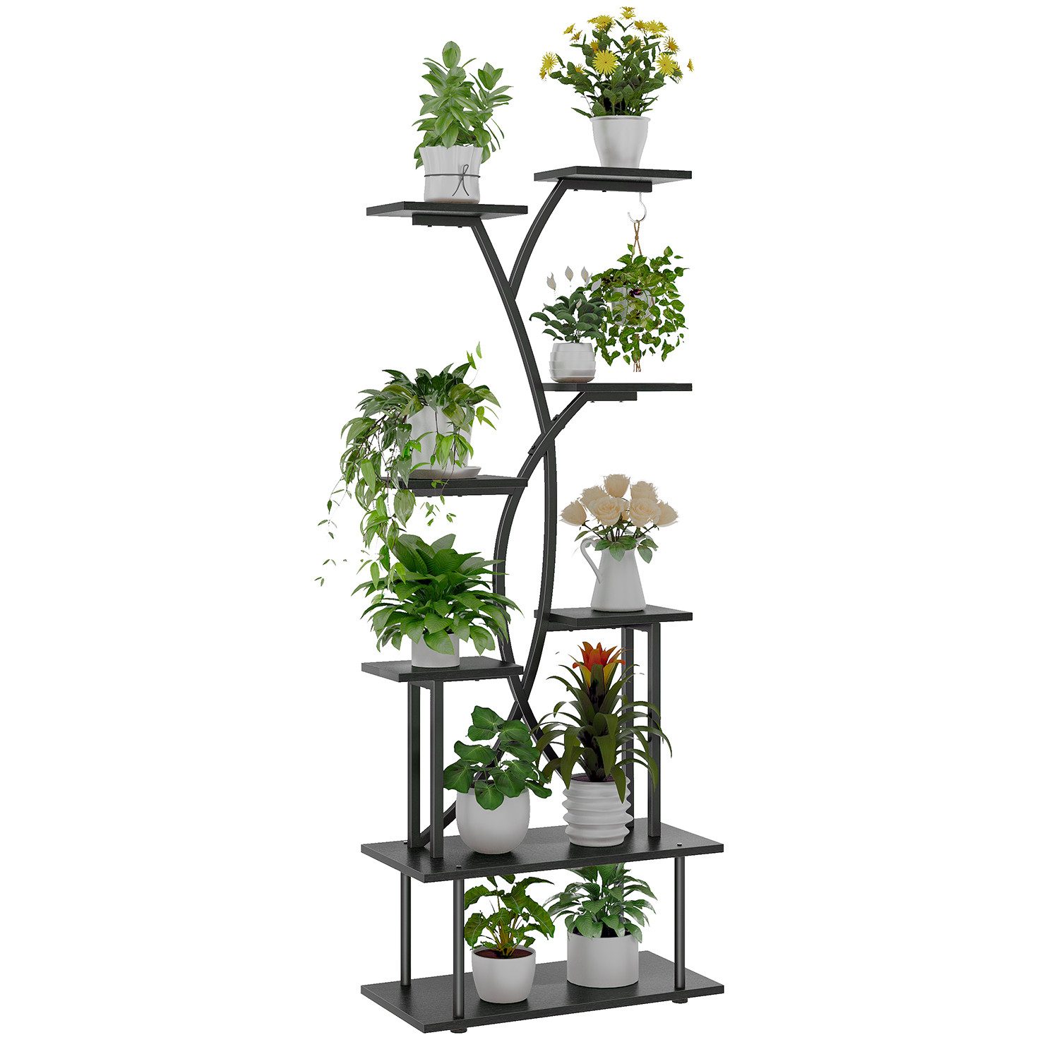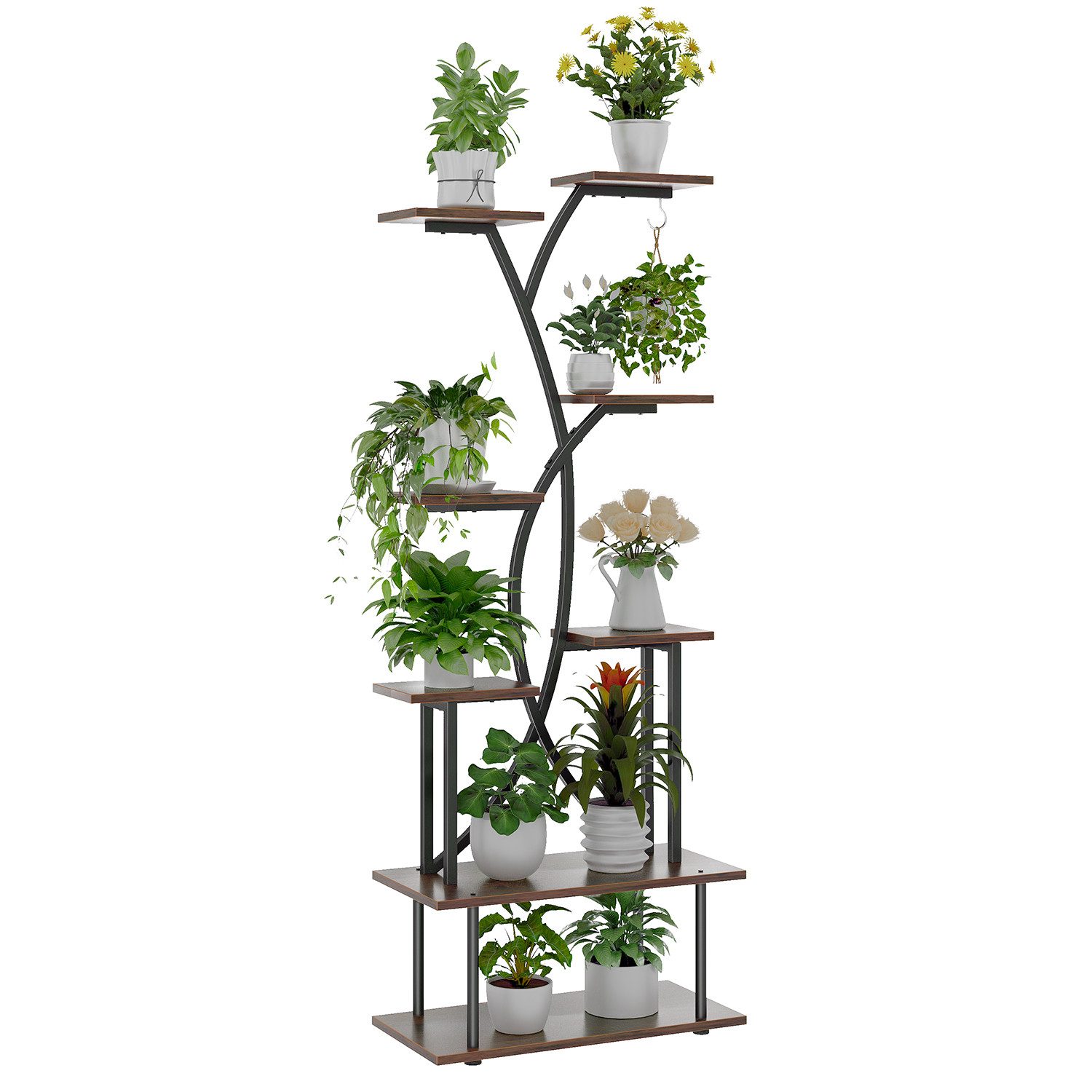 Blumenständer mit 8 Ebenen + Haken, 172cm, Metall/Holz,für Garten, Balkon & Wohnzimmer