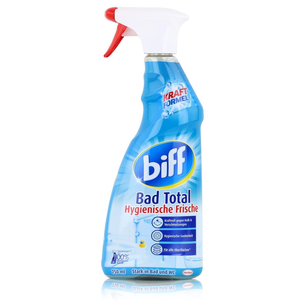 Der neue biff Hygiene Total Badreiniger: Eine leistungsstarke Lösung für ein sauberes Badezimmer Der neue biff Hygiene Total Badreiniger ist die perfekte Lösung für ein strahlend sauberes Badezimmer. Dieser kraftvolle Reiniger wird in einer 750-ml-Flasche geliefert und wurde speziell entwickelt, um hartnäckigen Schmutz, Kalk und Seifenreste von allen Oberflächen in Ihrem Badezimmer zu entfernen. Mit seiner antibakteriellen Formel bietet der biff Hygiene Total Badreiniger umfassende Reinigung und Schutz vor der übertragung von Infektionen und Krankheiten. biff Hygiene Total Badreiniger: Wirksame antibakterielle Formel Biff Hygiene Total Badreiniger verfügt über eine wirksame antibakterielle Formel, die bis zu 99,9 % der Bakterien und bestimmten Viren entfernt und so eine hygienische Umgebung für Ihre Familie schafft. Der Reiniger ist so formuliert, dass er vor der übertragung von Infektionen und Krankheiten schützt, was ihn zur idealen Wahl für Haushalte mit Kindern oder Haustieren macht. biff Hygiene Total Badreiniger: Entfernt hartnäckige Verschmutzungen und Kalkablagerungen Kalkablagerungen, Seifenreste und hartnäckige Verschmutzungen können schwer zu entfernen sein, aber mit dem biff Hygiene Total Badreiniger ist dies mühelos möglich. Mit seiner kraftvollen Formel entfernt der biff Hygiene Total Badreiniger mühelos Schmutz und Kalkablagerungen und hinterlässt die Oberflächen strahlend sauber und neu. biff Hygiene Total Badreiniger: Verhindert Schimmelbildung Die regelmäßige Anwendung von Biff Hygiene Total Badreiniger hilft, die Ansiedlung von Schimmelsporen in Ihrem Bad zu verhindern. Seine Formel ist so konzipiert, dass sie Schimmelbildung verhindert und so Ihre Familie langfristig schützt. Im Gegensatz zu anderen Reinigern, die Chlor und aggressive Rückstände enthalten, ist der biff Hygiene Total Badreiniger sicher und sanft zu allen Oberflächen in Ihrem Badezimmer.Inhaltsstoffe | <5% nichtionische Tenside, Duftstoffe (Limonene), Desinfektionsmittel (Ameisensäure, Benzalkoniumchlorid) |