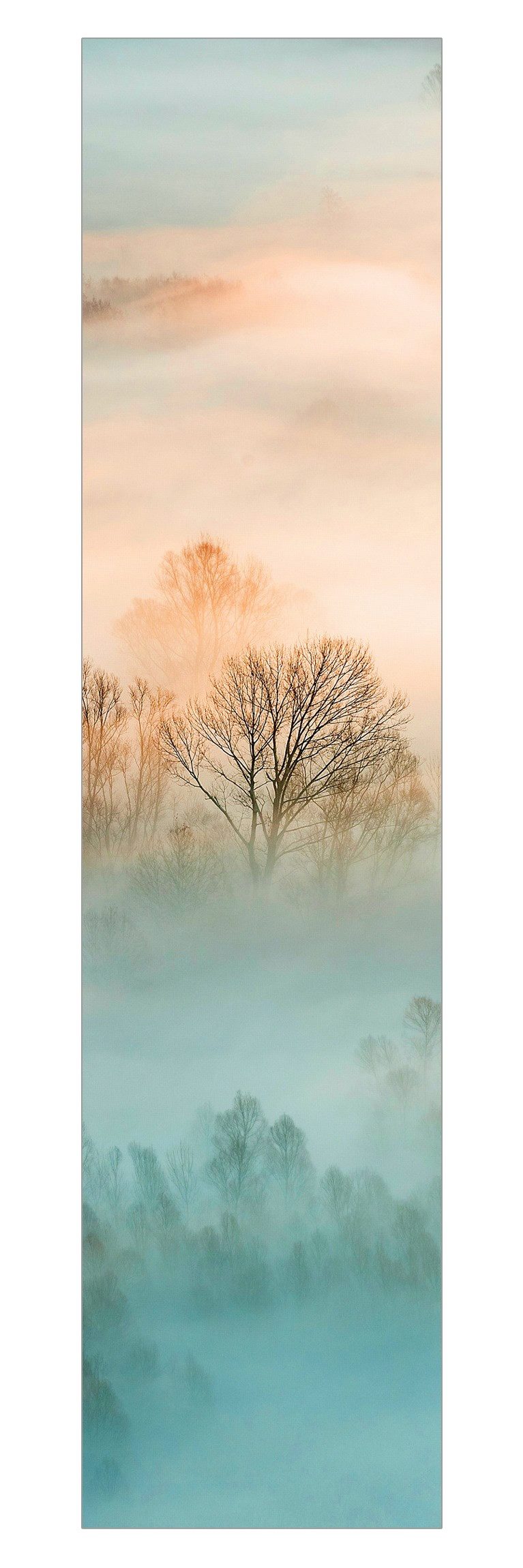 Bilderdepot24 Schiebegardine modern Flächenvorhang blickdicht Nebel Sonnenaufgang (1 St), halbtransparent, Wohnzimmer große Flächengardine lichtdurchlässig für Klemm-System