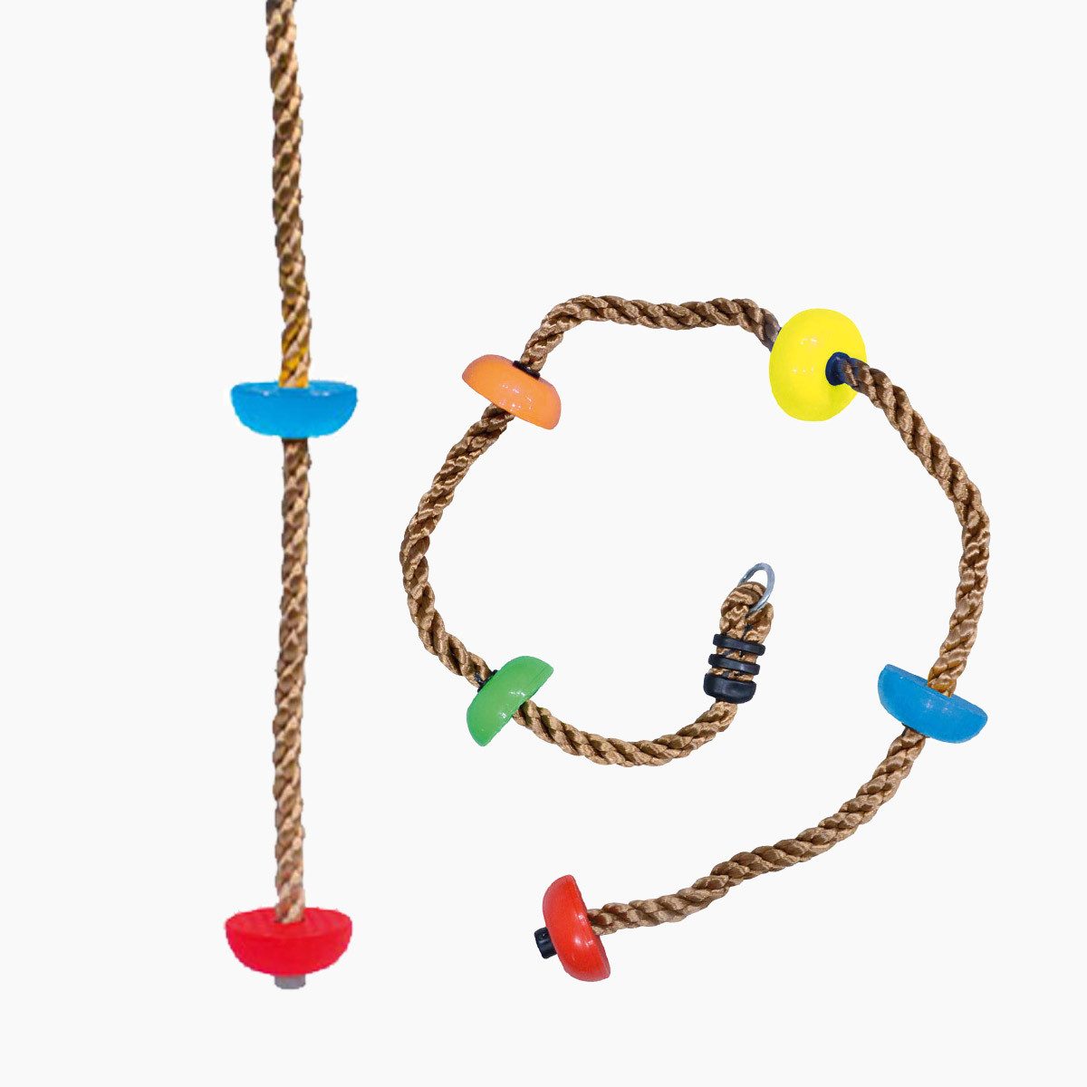 Mit einer Tragfähigkeit von bis zu 270 kg und einem stabilen Metallkarabiner lässt es sich sicher und einfach befestigen. Die bunten Trittflächen erleichtern das Klettern und bieten optimalen Halt, während das robuste Seilmaterial aus Polyethylen für Langlebigkeit und Widerstandsfähigkeit sorgt