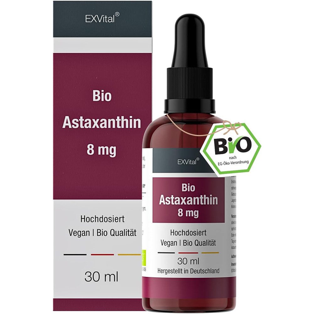 EXVITAL BIO ASTAXANTHIN TROPFEN: Hochdosiert mit 8 mg Astaxanthin pro Dosierung (12 Tropfen / Tag). Eine Flasche enthält ca. 1000 Tropfen. Reicht für 83 Tage! pflanzliches Astaxanthin aus der Mikroalge Haematococcus Pluvialis. MAXIMALE BIOVERFÜGBARKEIT: Bessere Alternative zu Kapseln. Direkt in den Mund geträufelt werden die Tropfen über die Mundschleimhäute aufgenommen & sind hoch bioverfügbar. Einfache & exakte Dosierung danke der Pipette. 100% VEGAN & NATÜRLICH: Frei von tierischen Bestandteile, Alkohol, Konservierungsstoffen & anderen unerwünschten Zusätzen. DEUTSCHES QUALITÄTSPRODUKT: Höchste Qualität & strengste Kontrollen von der Auswahl der Rohstoffe bis hin zum Endprodukt. Unsere Produkte werden nach besten Qualitäts- & Sicherheitsstandards, TÜV, ISO-Konform zu 100% in Deutschland hergestellt.