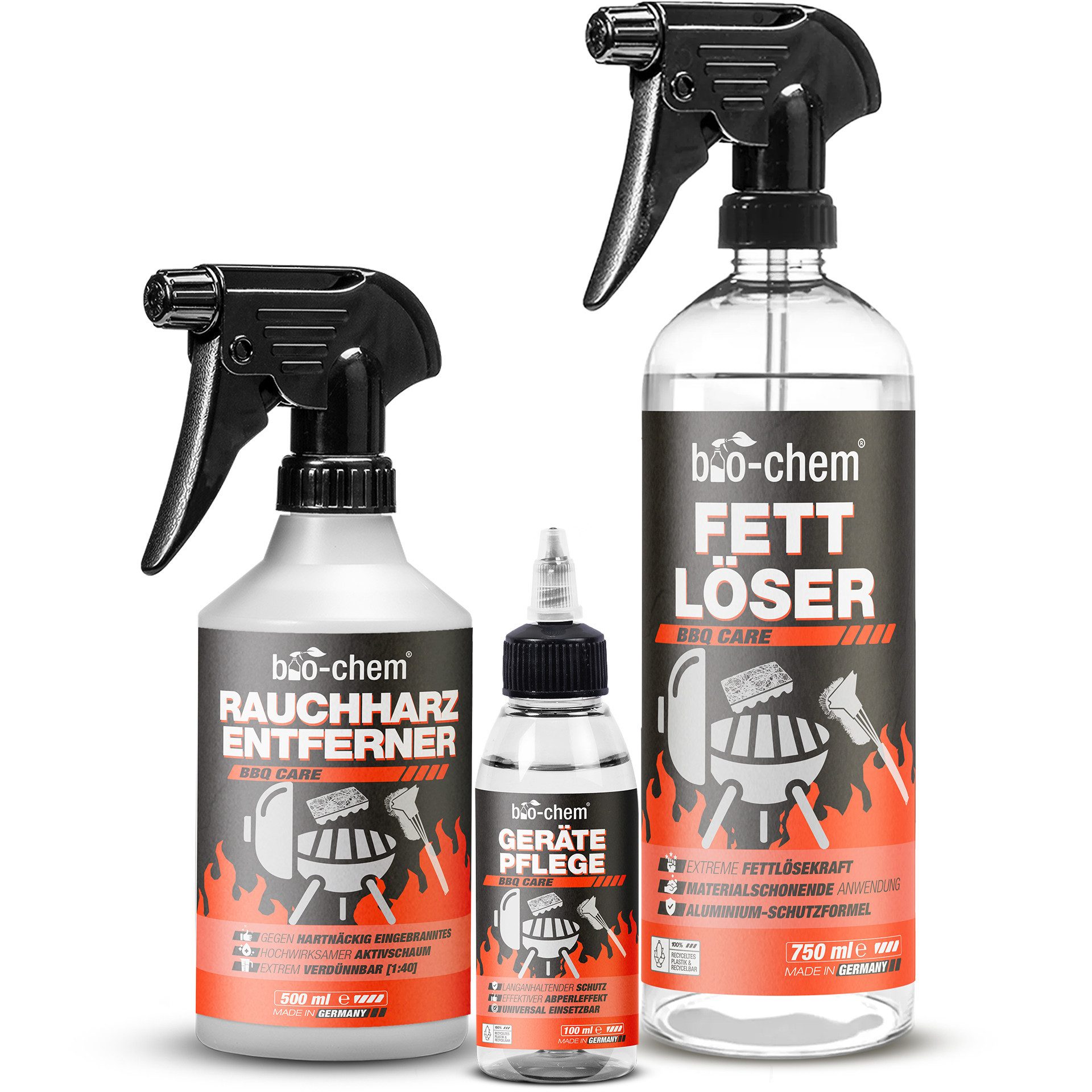 Set beinhaltet | BBQ-Cleaner 0,75l Gerätepflege 100ml Rauchharz-Entferner 0,5l |