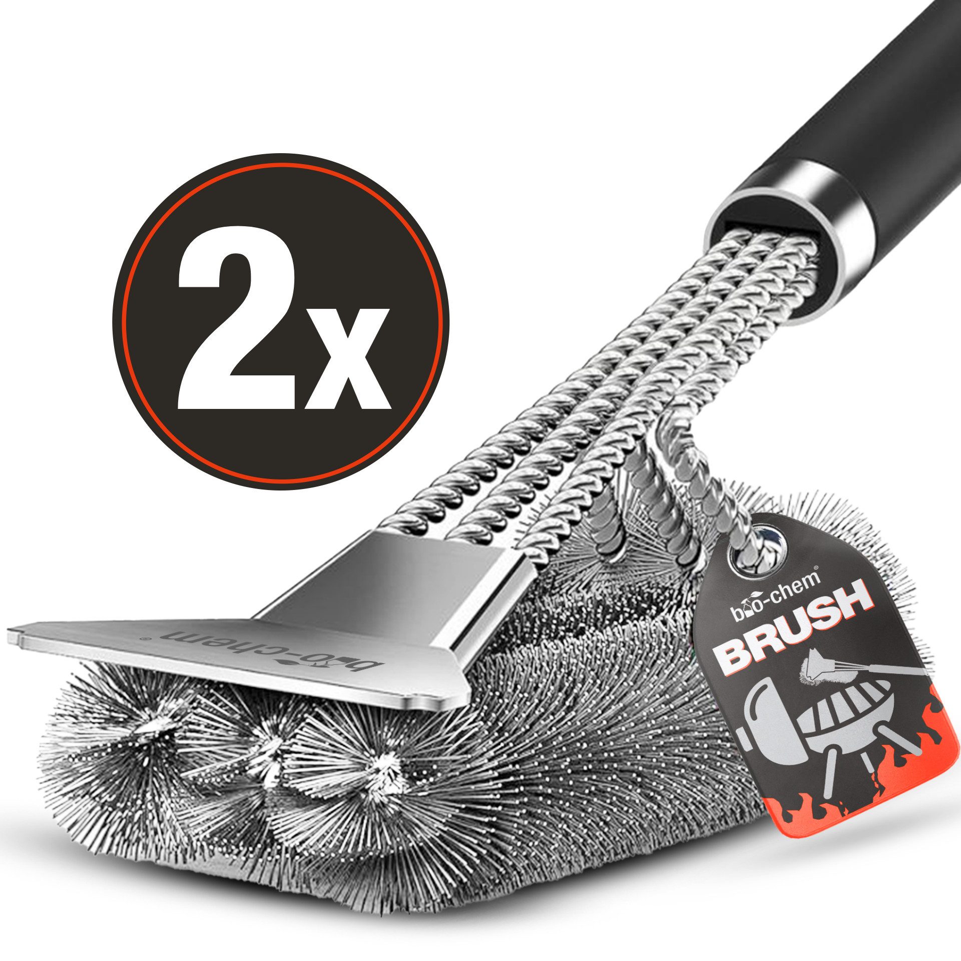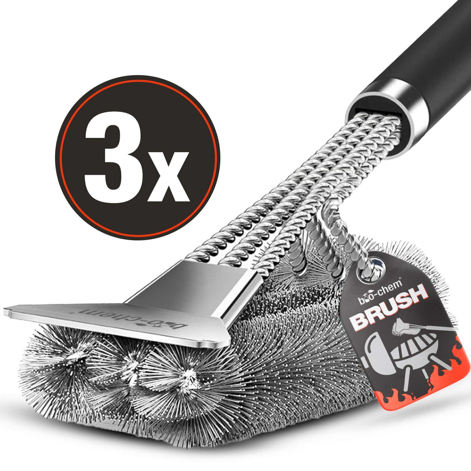 Hochwertige Grillbürsten mit Edelstahl-Borsten & Schaber. 3-facher Bürstenkopf für effiziente Reinigung. Ergonomischer Griff mit Wärmedämmung & Aufhängehaken.