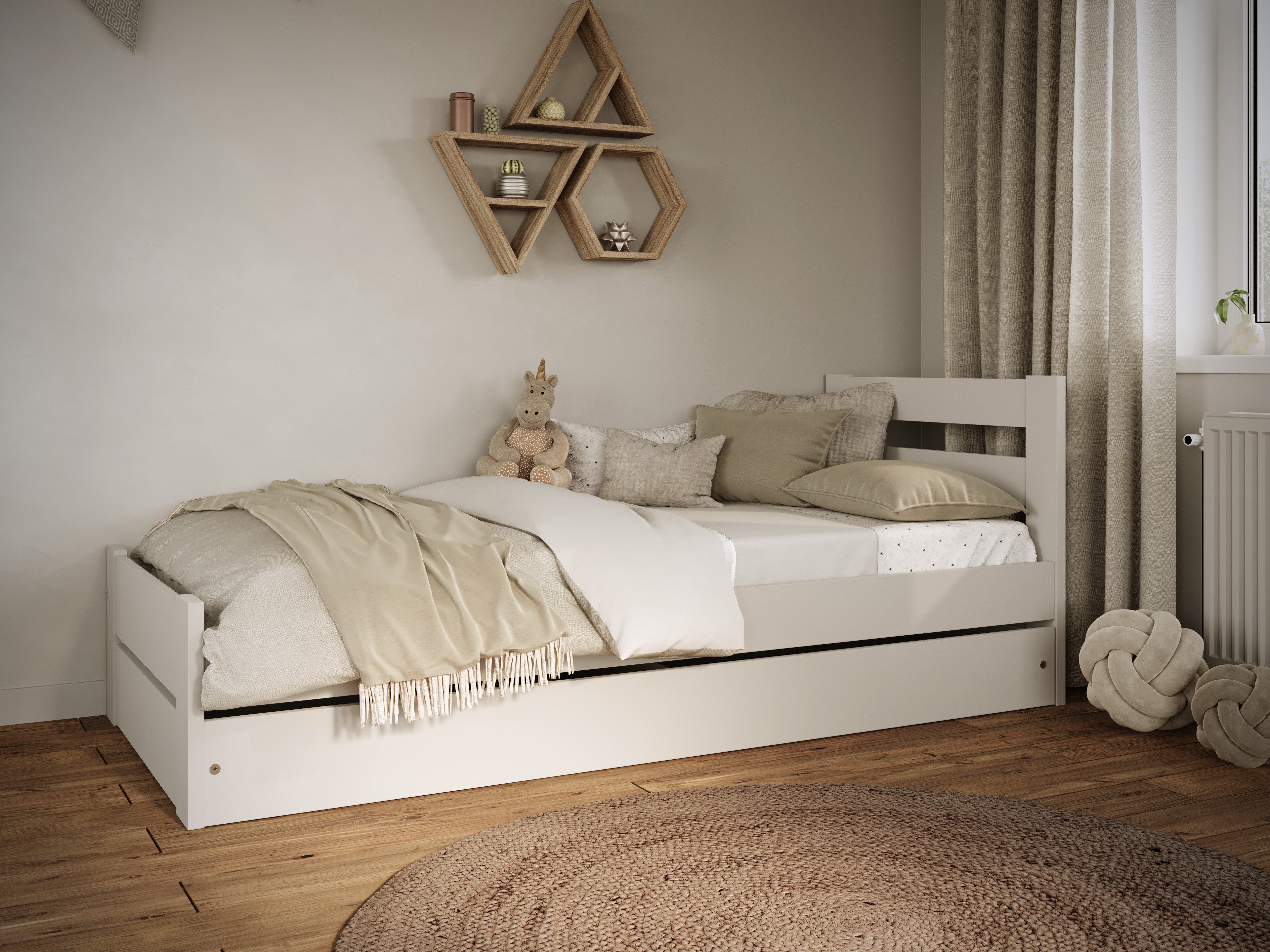 Unser Jugendbett mit geräumiger Schublade kombiniert modernes Design mit praktischen Lösungen, die sowohl Teenager als auch ihre Eltern begeistern. Erhältlich in zwei Größen – 160x80 cm und 180x90 cm – bietet das Bett eine große Schublade, ideal zum Verstauen von Bettwäsche, Spielzeug oder anderen Gegenständen, was die Ordnung im Zimmer erleichtert. Hergestellt aus hochwertigen Materialien, die aus kontrollierten Quellen stammen, ist das Bett nicht nur langlebig, sondern auch nachhaltig. In Polen produziert, erfüllt es die höchsten Qualitätsstandards und garantiert Komfort sowie Langlebigkeit. Wählen Sie ein Bett, das Funktionalität mit modernem Stil vereint!