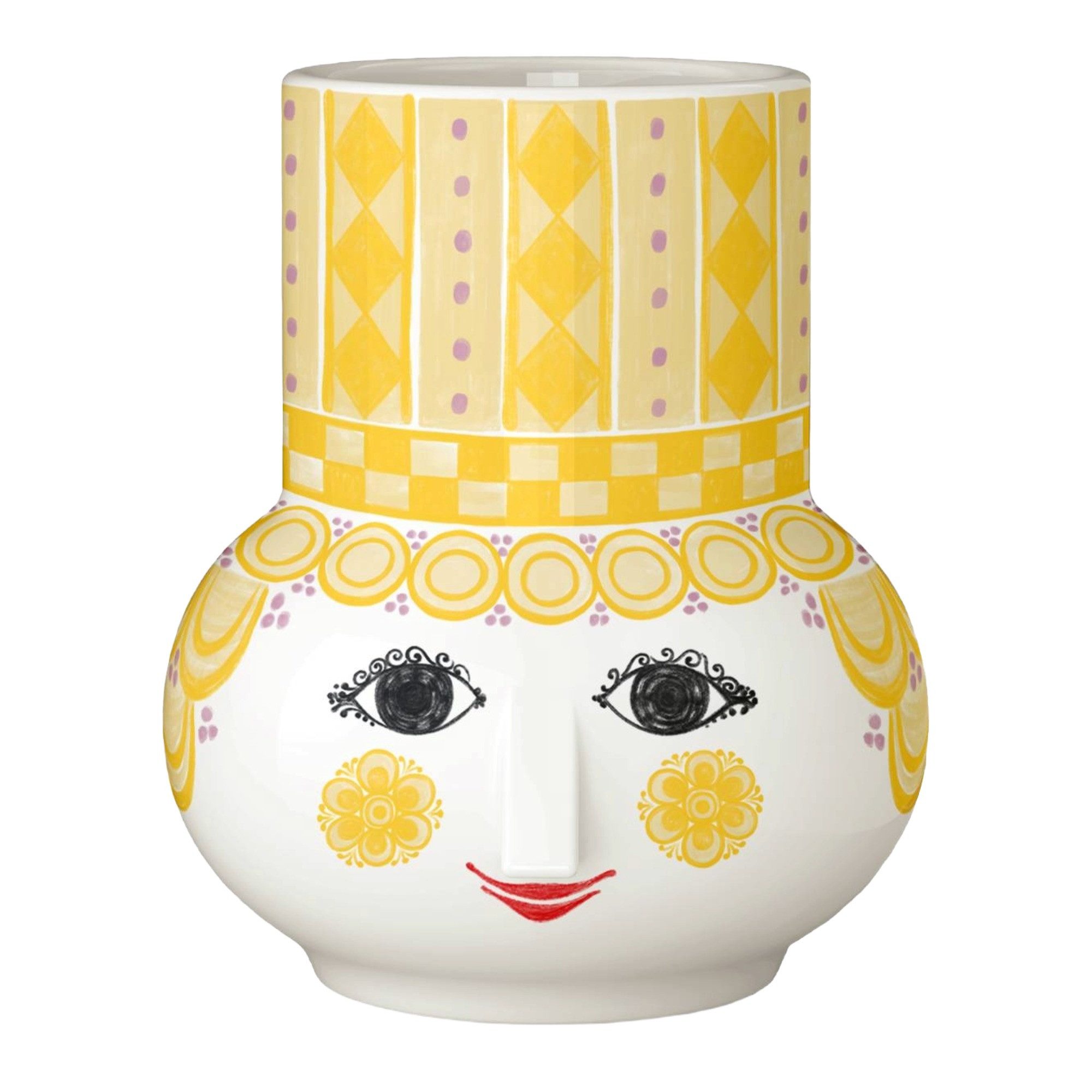 Der Bjørn Wiinblad Olga Kerzenständer bringt pure Lebensfreude in dein Zuhause. Mit seinem charmanten Gesicht, den mandelförmigen Augen und den sanft lächelnden Lippen erinnert er an Wiinblads ikonische Figuren aus seinem farbenfrohen Designuniversum. Die kräftige gelbe Glasur, kombiniert mit lavendelfarbenen Punkten, verleiht jedem Raum eine warme, fröhliche Atmosphäre – ein echtes Statement für Individualität und Stil.