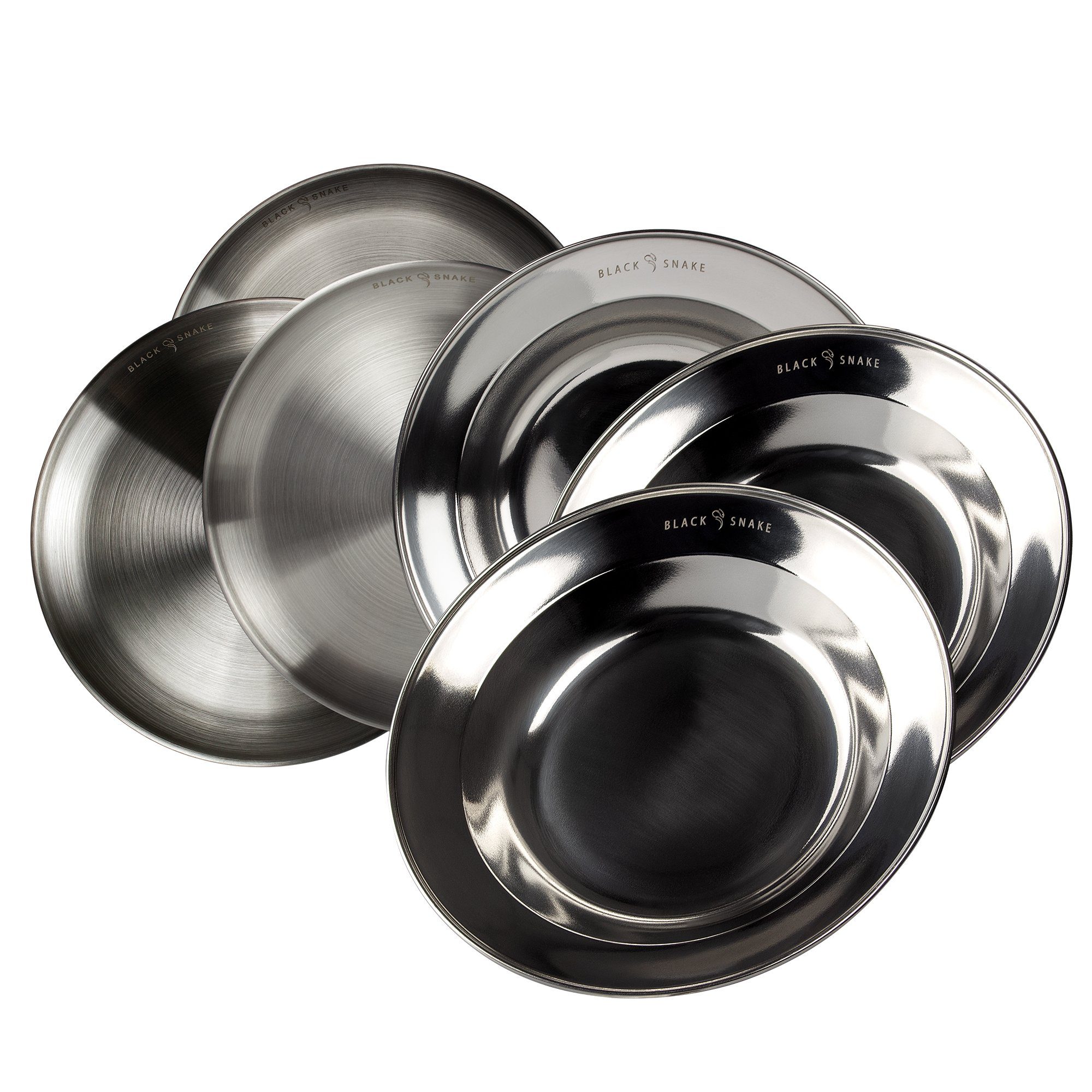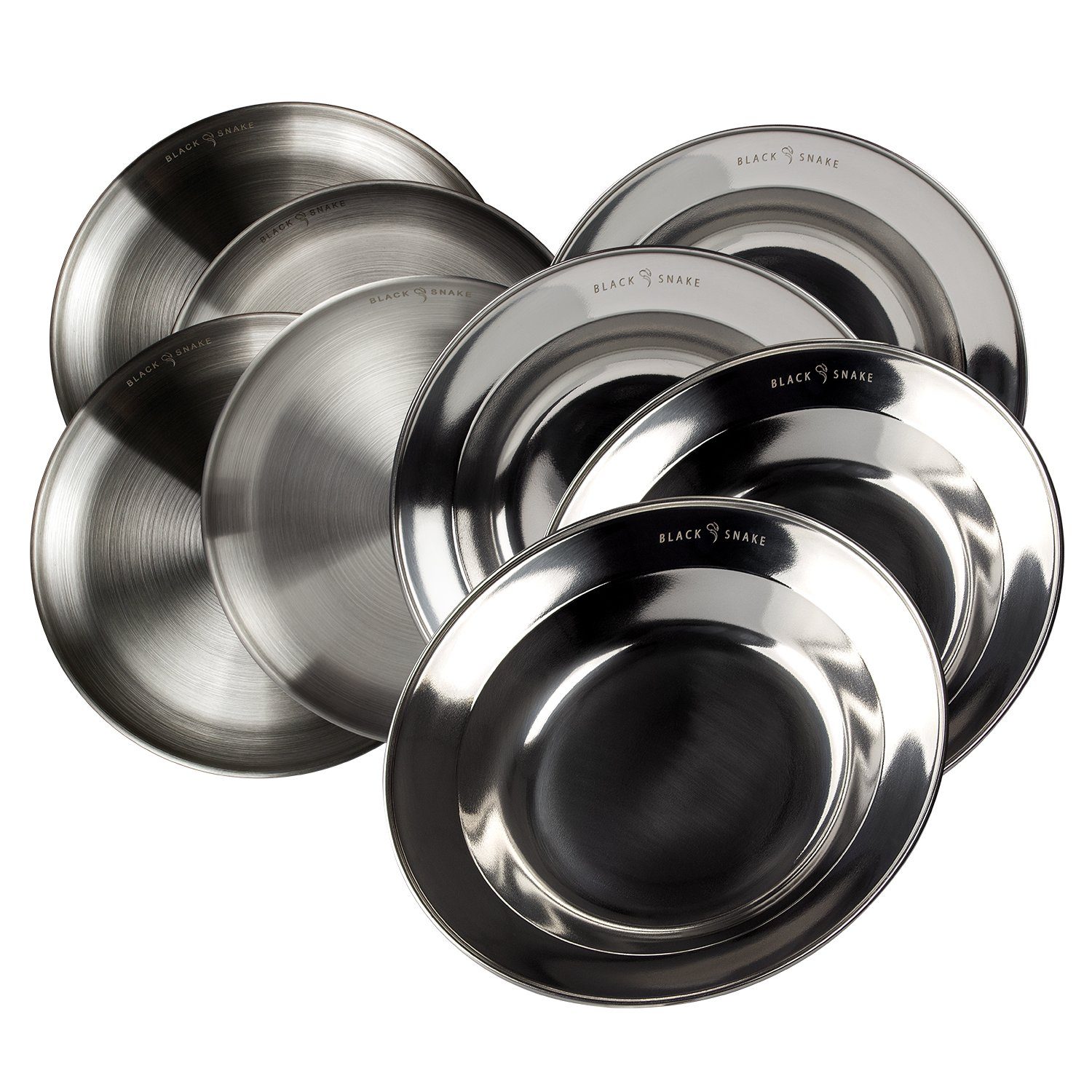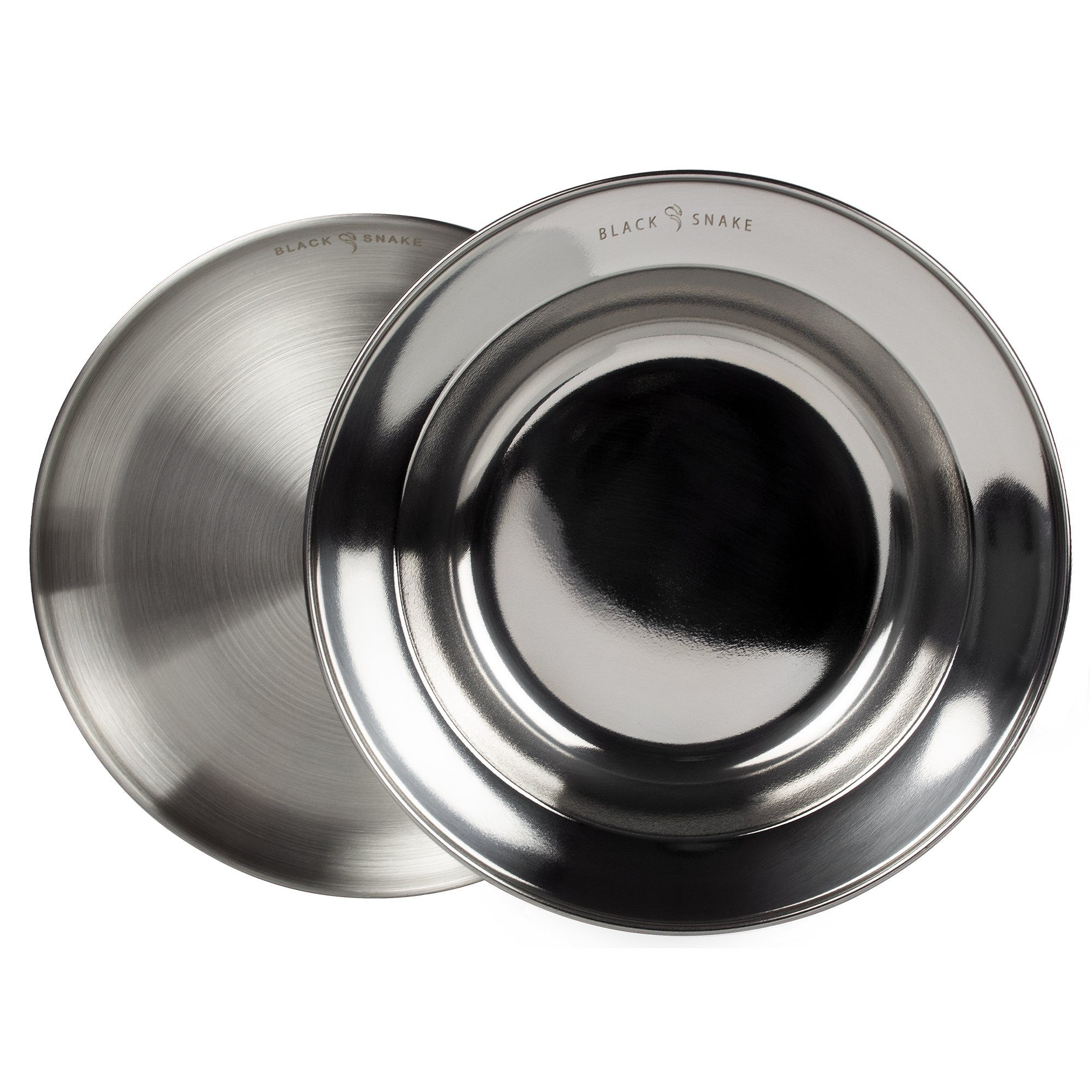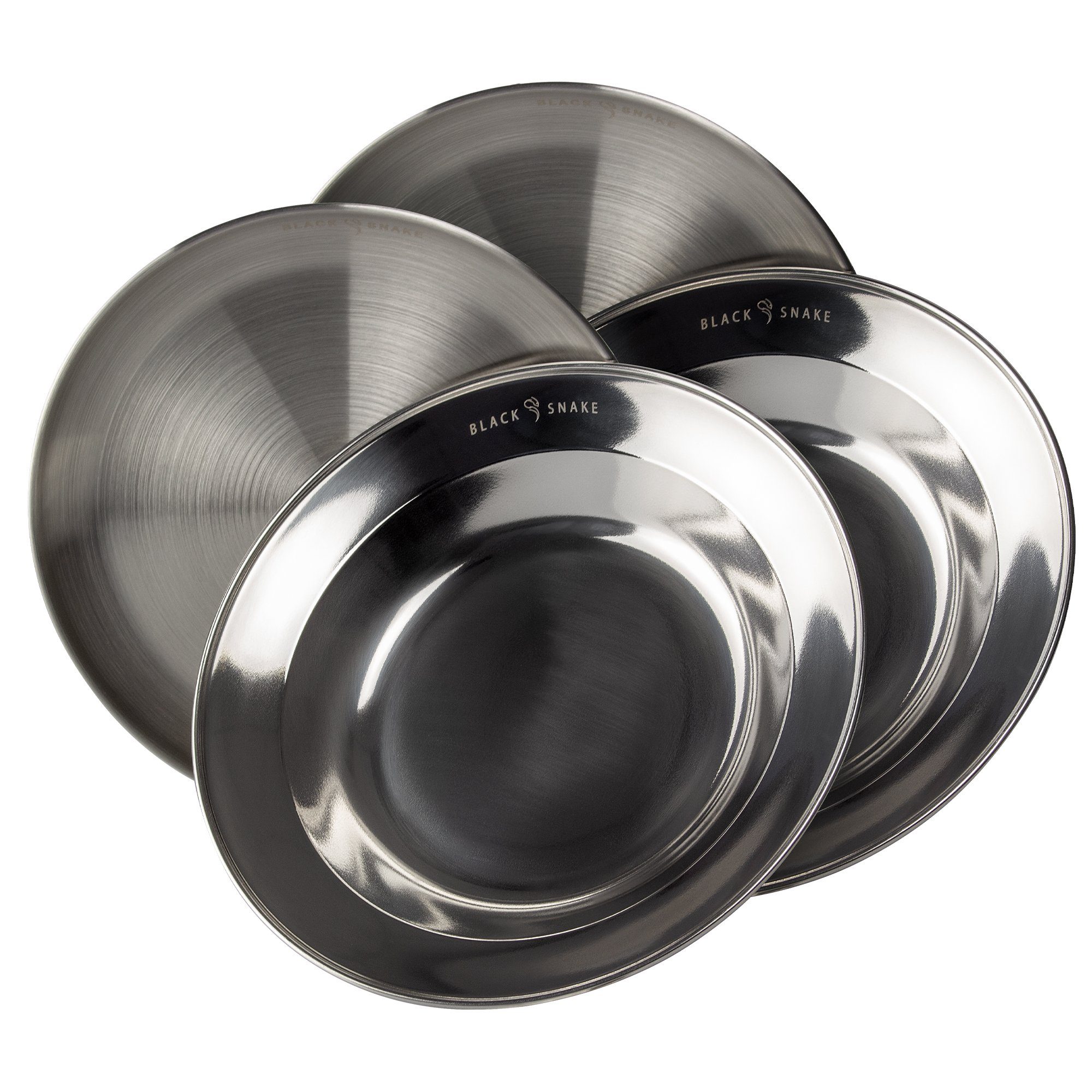 · praktische Teller von Black Snake® im Set · gebürsteter rostfreier Edelstahl · robuste und pflegeleichte Eigenschaften · flache Teller und tiefe Teller · ca. 23-24 cm Durchmesser · edle Black Snake® Gravur