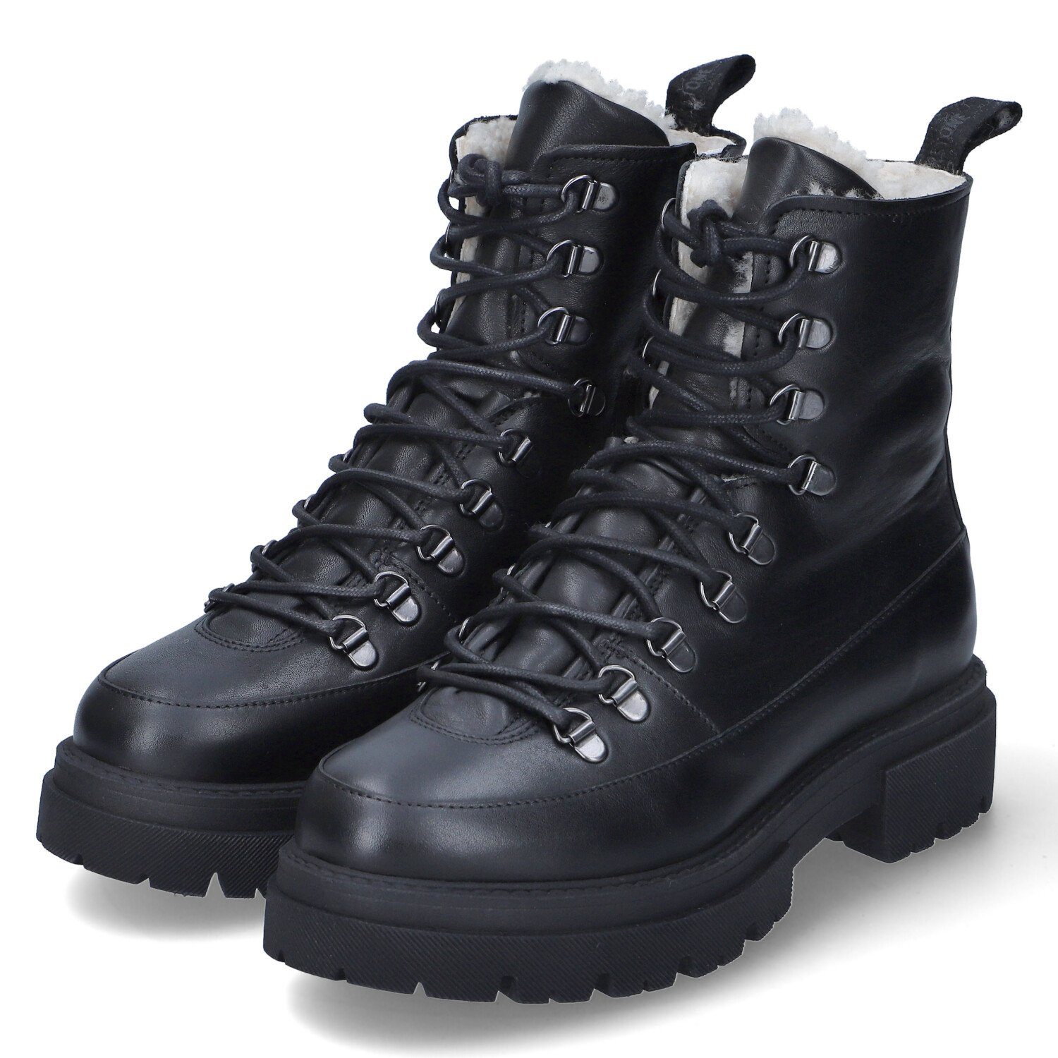 Blackstone Damen Stiefeletten/ Schnürstiefeletten/ Combat Boots/ Winterstiefeletten Schwarz Glattleder - Schnürsenkel - Reißverschluss - Anziehlasche - Ziernähte - dezente Markendetails - warmes Lammfellfutter - verstärkter Fersenbereich - gepolsterte Wechseldecksohle - robuste, rutschhemmende Laufsohle mit Profil - stabiler Blockabsatz