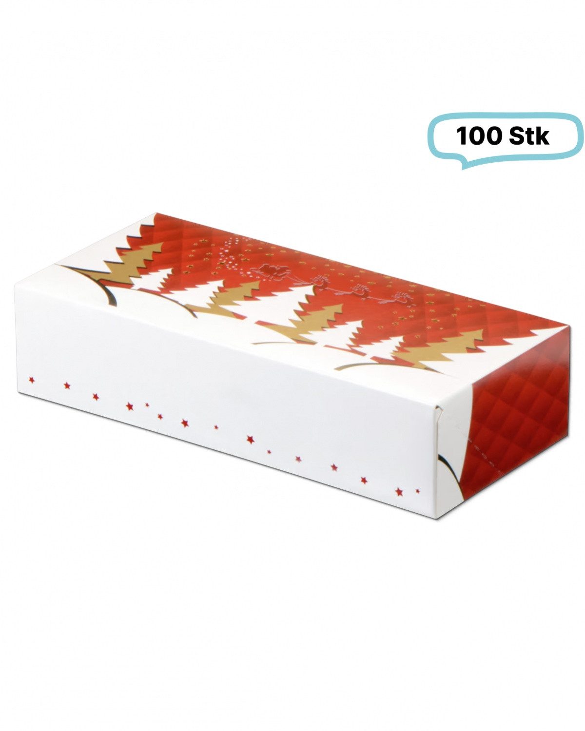 Der Gebäckkarton bietet eine festliche und sichere Verpackungslösung für Christstollen, Weihnachtsgebäck oder kleine Torten. Hergestellt aus gestrichenem Chromokarton aus hochwertiger Frischfaser, überzeugt die Verpackung durch einen weihnachtlichen Druck mit Goldprägung, die Tannenbäume und Sterne besonders glanzvoll hervorhebt. Die flach angelieferte Box spart Platz und lässt sich schnell und einfach aufrichten. Zudem ist der Karton aluminiumfrei und recyclingfähig, was ihn umweltfreundlich macht.