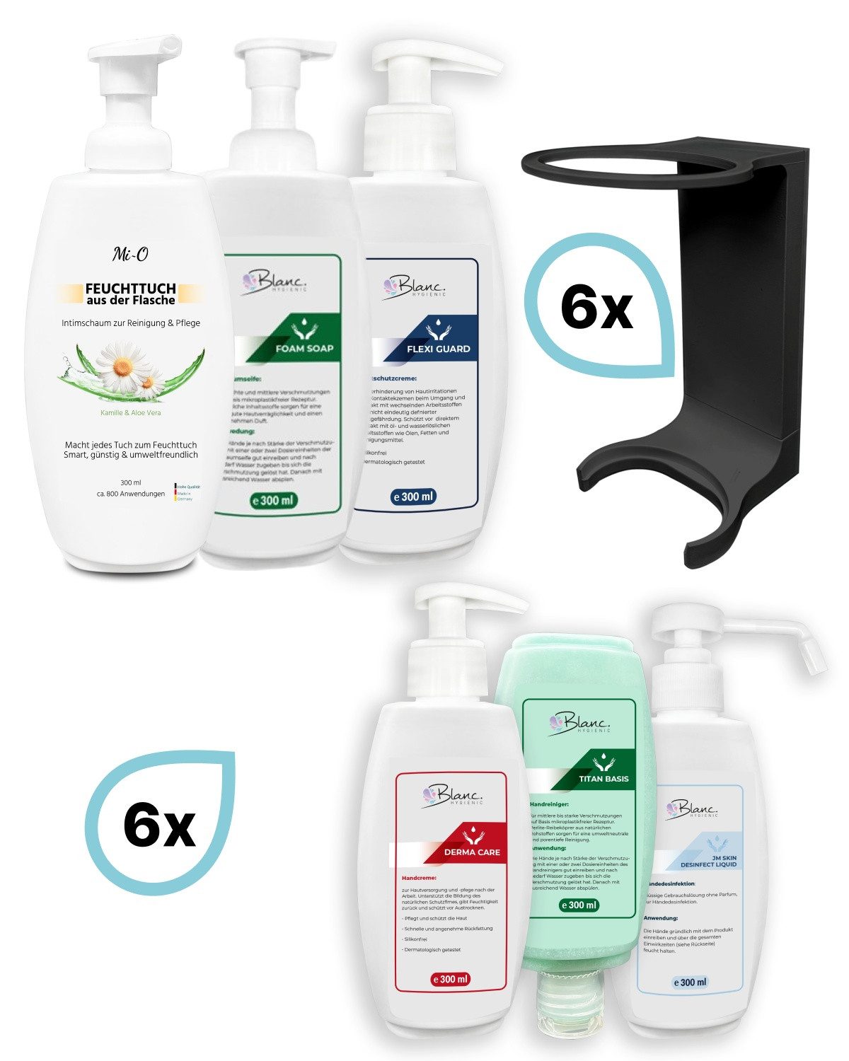 Das Komplett-Set des Mini Fix-Systems umfasst 6 Spender und Wandhalterungen in Weiß oder Schwarz sowie 6 Flaschen à 300 ml. Das stabile Spendersystem lässt sich einfach an der Wand montieren, entweder mit Klebepads oder Schrauben, und bietet eine robuste Lösung für die Handhygiene. Der Grobreiniger im Set ist mikroplastikfrei und dermatologisch getestet, während die Hand- und Hautdesinfektion medizinisch geprüft und gelistet ist. Впередe enthaltene Produkte sind eine milde Schaum-Handseife, eine parfümierte Hautpflegecreme mit Kamillenwirkstoff, eine silikonfreie Hautschutzcreme sowie ein Intim-Reinigungs- und Pflegeschaum auf Basis von Kamille und Aloe Vera. Все Produkte sind für Wandspender, freistehende Nutzung oder für unterwegs geeignet und werden in Deutschland hergestellt.