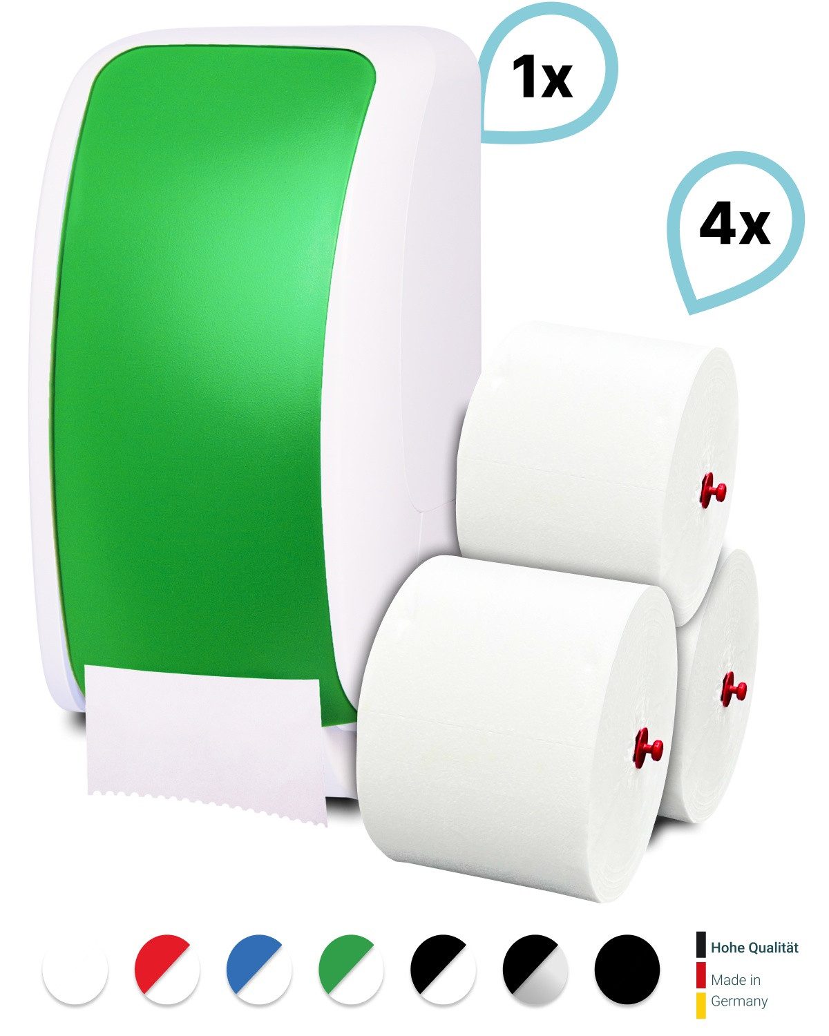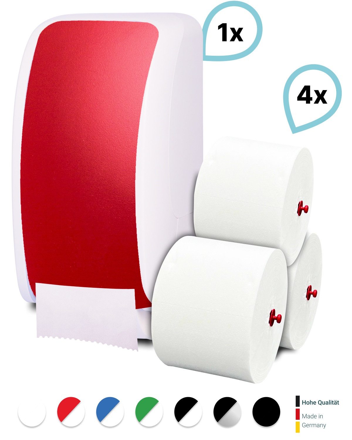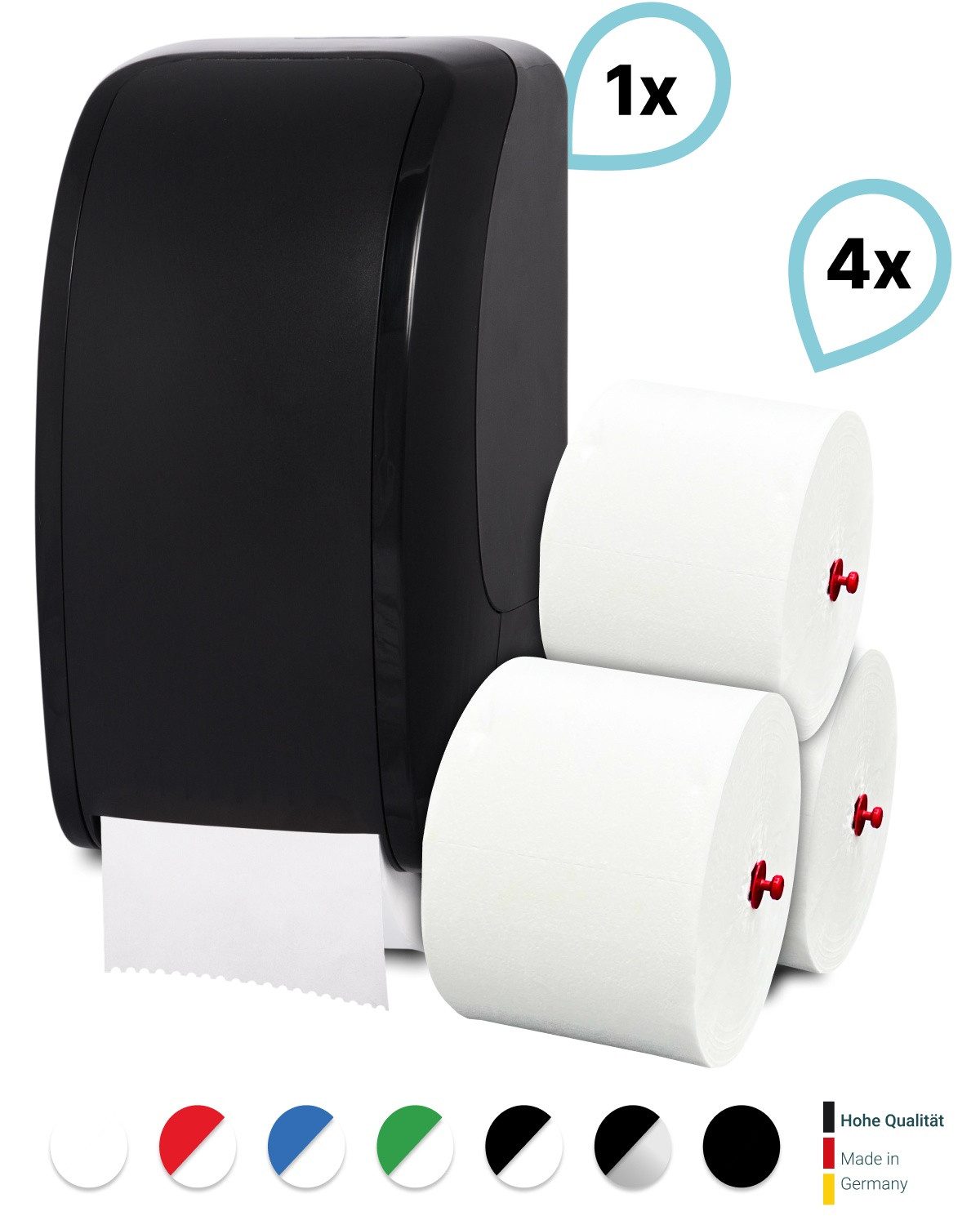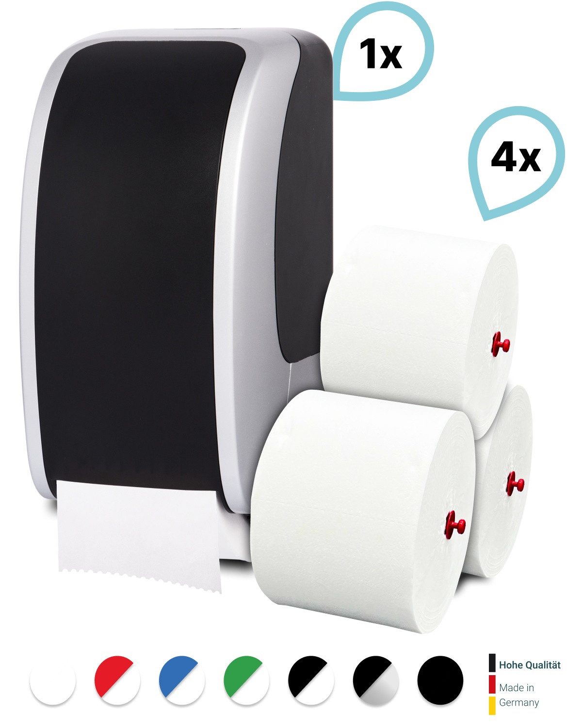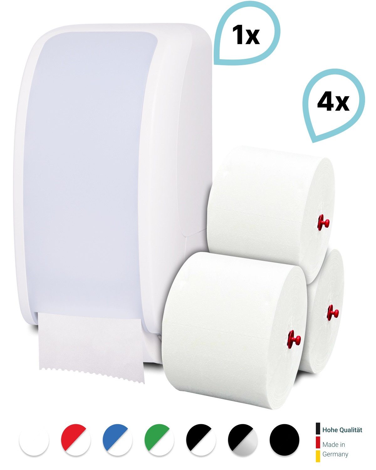Dieses Produktset besteht aus 1 Blanc Cosmos Toilettenpapierspender + 4 passende Toilettenpapierrollen Long Life 3L