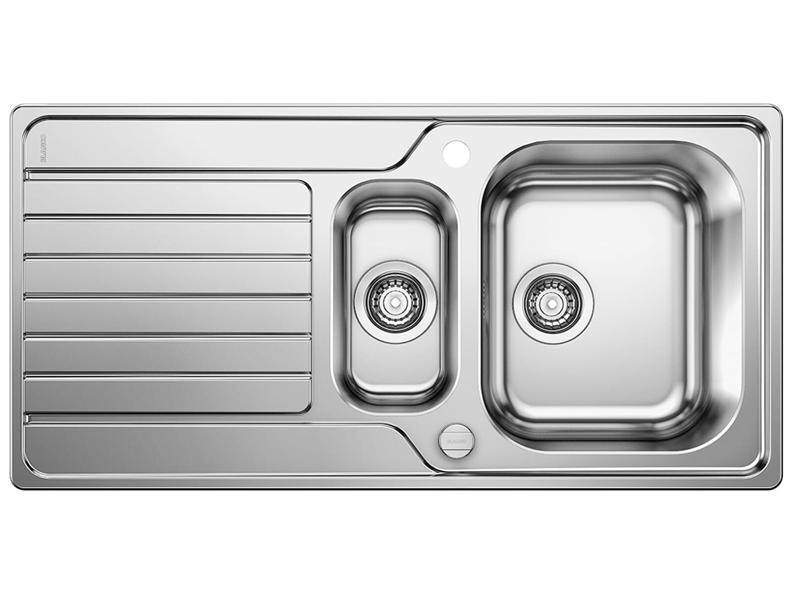 Lieferumfang | Blanco Dinas 6 S Edelstahlspüle Bürstfinish 523 379, Ablaufgarnitur mit Raumsparrohr, 2 x 3 ½'' Korbventil, Ablauffernbedienung mit Drehexzenter für das Hauptbecken, Dichtungen, |