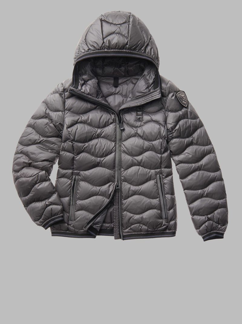 Winterjacke aus Nylon. wellenförmiges Steppmuster. Reißverschluss mit Doppelschieber. seitliche Eingrifftaschen mit Reißverschluss. gestreifter Saum und Ärmelabschluss. abnehmbares Glitter-Logo-Badge am Ärmel. wärmende Kapuze