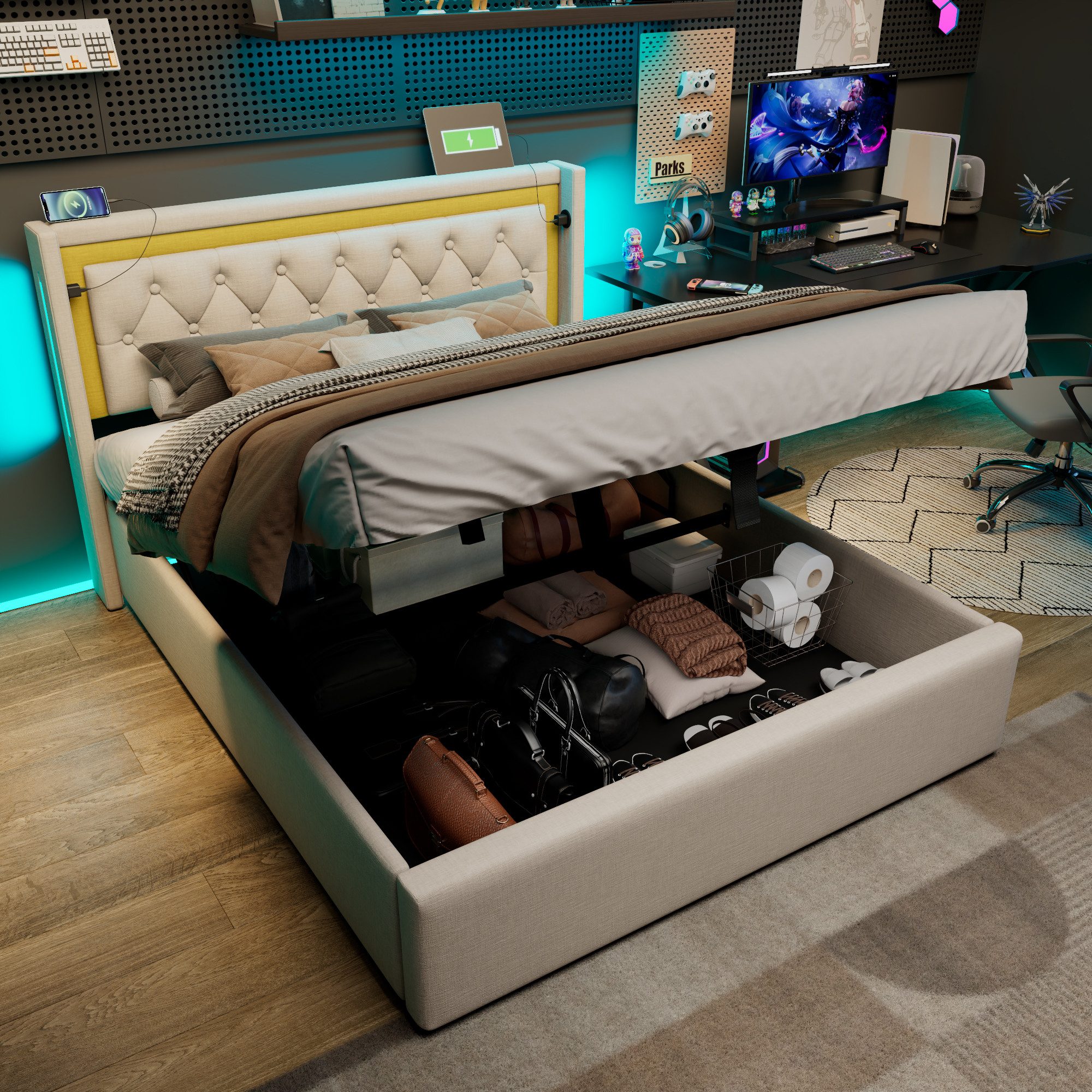 ● Dieses Kopfteil hat ein einzigartiges Design mit einem komfortablen und strapazierfähigen Stoff für Bett und Kopfteil. Die LED-Leuchten am Kopfteil können per Fernbedienung in Farbe und Helligkeit eingestellt werden. Außerdem befindet sich an der Seite des Bettes ein USB+Type-C-Ladeanschluss für einfaches Aufladen im Bett.