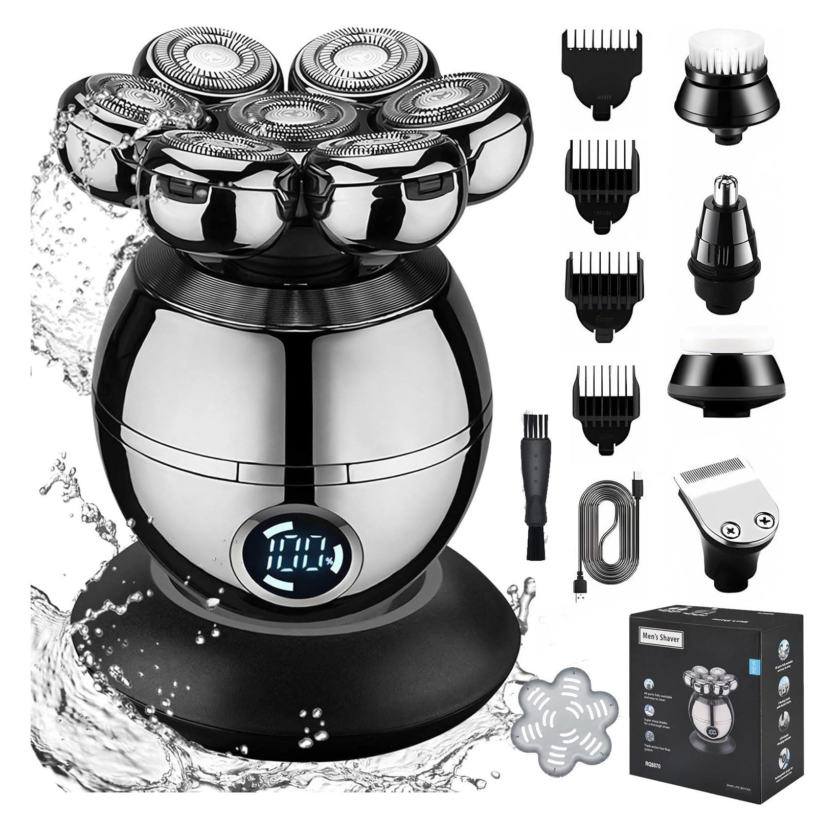 Lieferumfang | 1 x 7D Rotationsrasierer 1 x Haarschneidekopf 1 x Nasen-/Ohrentrimmer 1 x Gesichtsreinigungsbürste 1 x Gesichtsmassage-Bürste 4 x Begrenzungskämme 1 x Kabellose Ladestation 1 x Typ-c-Ladekabel |