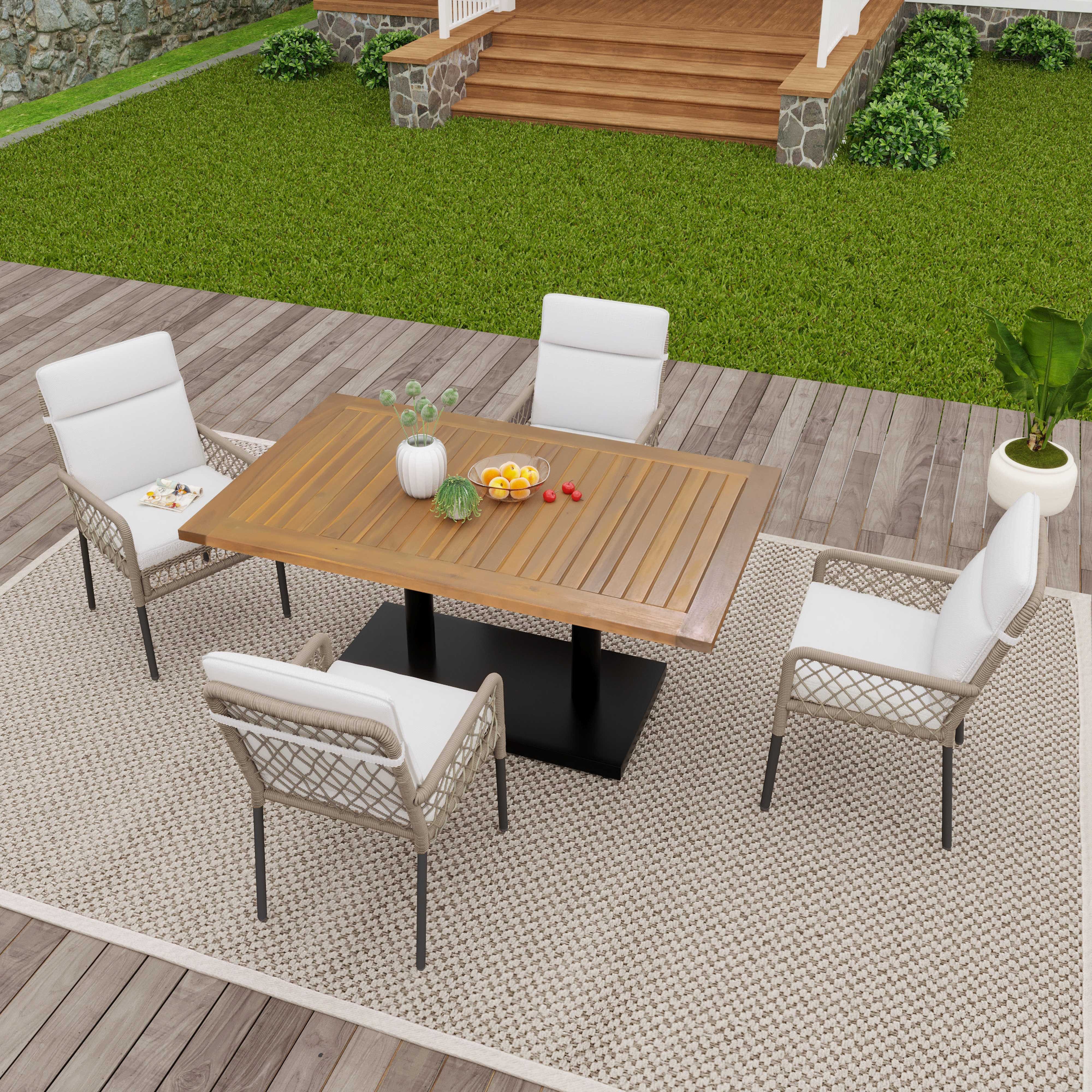Dieses elegante Esstisch-Set für den Außenbereich kombiniert Haltbarkeit, Komfort und stilvolles Design – ideal für die Unterhaltung im Freien. Die Tischplatte aus massivem Akazienholz besticht durch ihre natürliche Maserung und ist gleichzeitig wetterbeständig. Das robuste Tischgestell aus verzinktem Eisen garantiert Stabilität und ist resistent gegen Rost und Korrosion. Die Stühle sind mit handgeflochtenem Polyrattan bezogen, was sowohl die Stabilität als auch die Langlebigkeit des Sets unterstützt. Die 5 cm dicken Sitzpolster sind wasserdicht, pflegeleicht und abnehmbar, sodass sie sich einfach reinigen lassen.