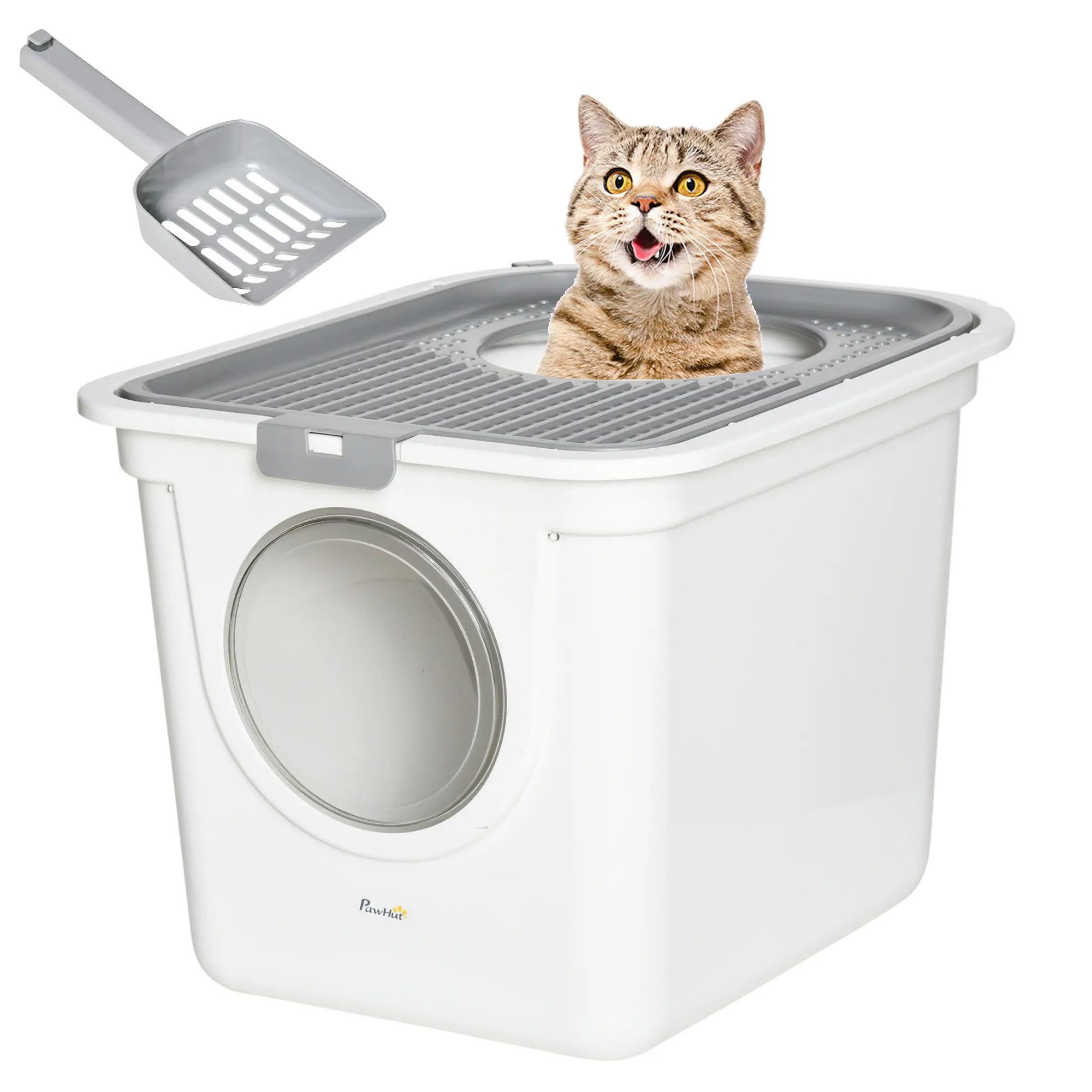 Die Vordertür dient als bequemer Eingang, während die obere Öffnung als Ausgang konzipiert ist. Beim Herausspringen fällt überschüssige Streu zurück in die Toilette – so bleibt Ihr Zuhause sauberer. Diese Lösung ist besonders für aktive und verspielte Katzen geeignet.