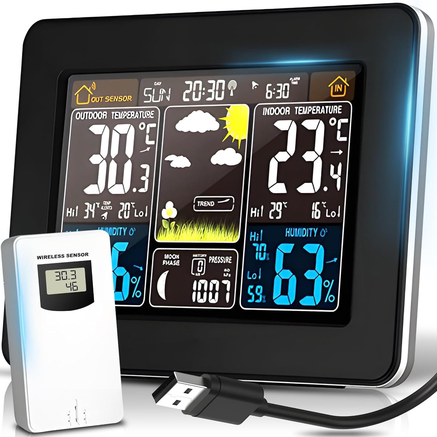 Farbige Wettervorhersage; Innen-/Außenthermometer und Hygrometer; MAX/MIN-Temperatur- und Luftfeuchtigkeitsanzeige; Luftdruck; Mondphase; täglicher Alarm und Schlummerfunktion; Hintergrundbeleuchtung in 3 Stufen wählbar mit USB-Kabel.