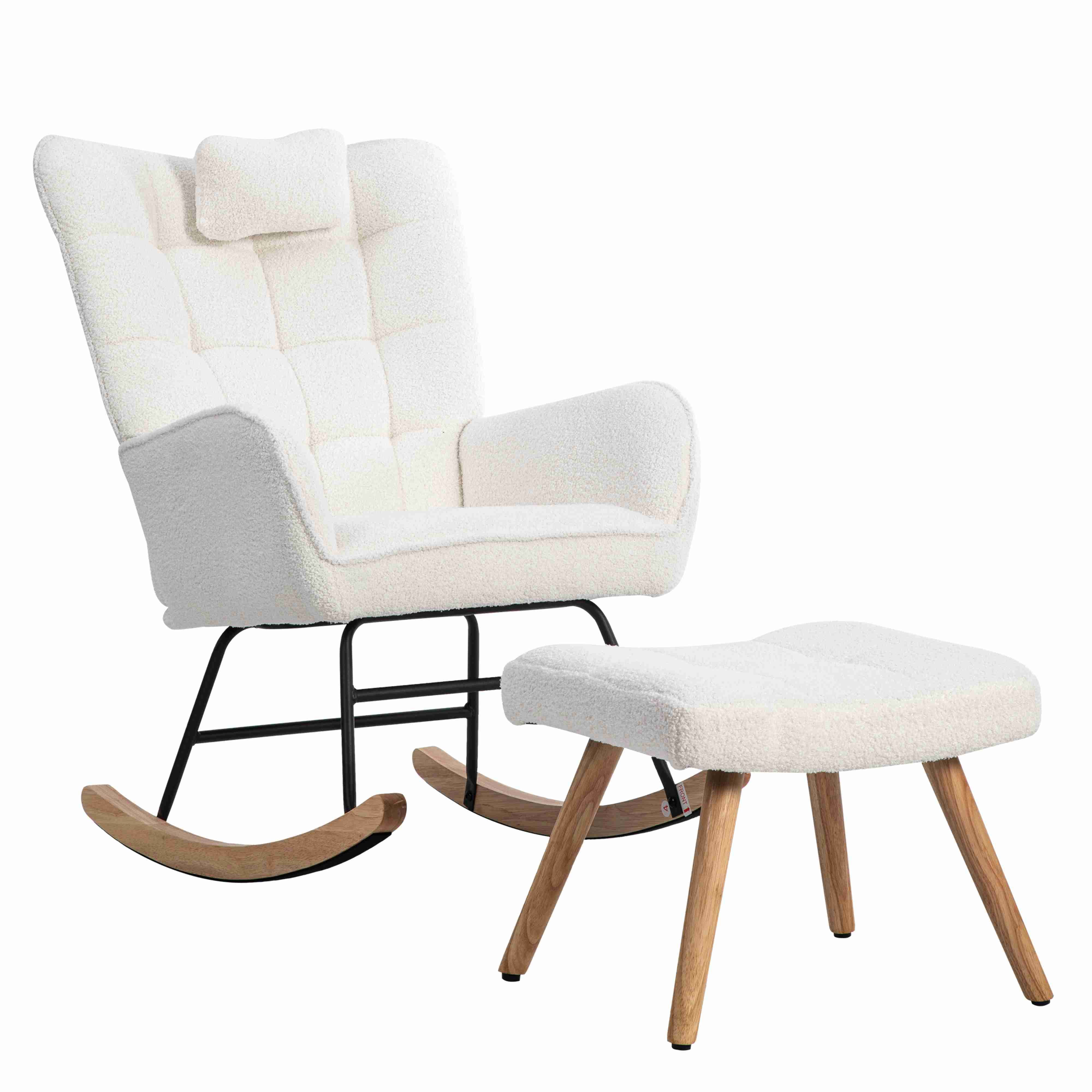 Der Schaukelstuhl und Fußhocker sind aus robustem Gummibaumholz gefertigt, das für Langlebigkeit bekannt ist. Die kürzeren Beine des Schaukelstuhls bieten zusätzliche Sicherheit beim sanften Schaukeln.