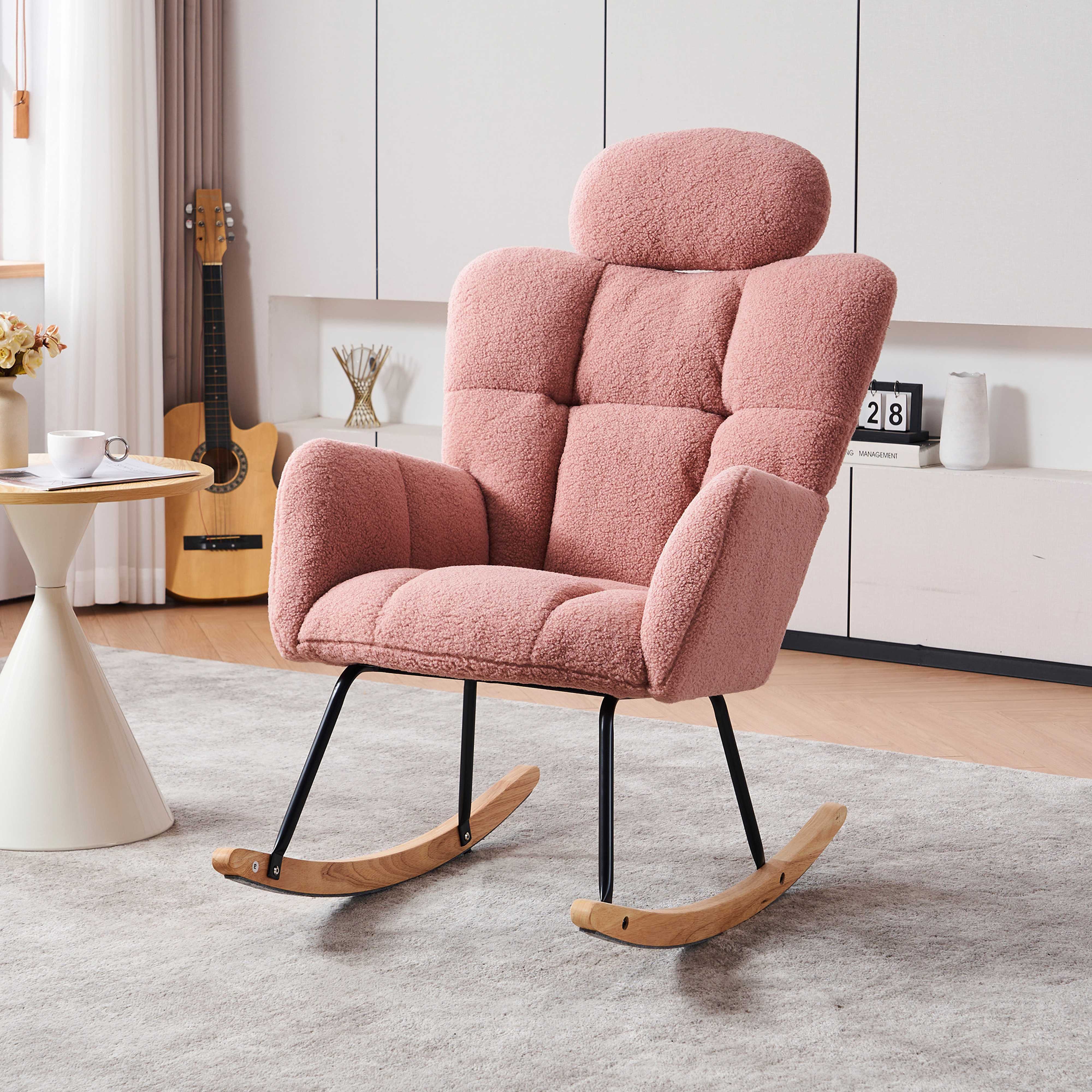 Gefertigt aus weichem Teddy-Stoff, gefüllt mit hochwertigem Schaumstoff und ausgestattet mit einem stabilen Holzrahmen sowie einer schwarz lackierten Metallbasis. Die geschwungenen Schaukelbeine aus Holz sorgen für ein sanftes, entspannendes Schaukelerlebnis.