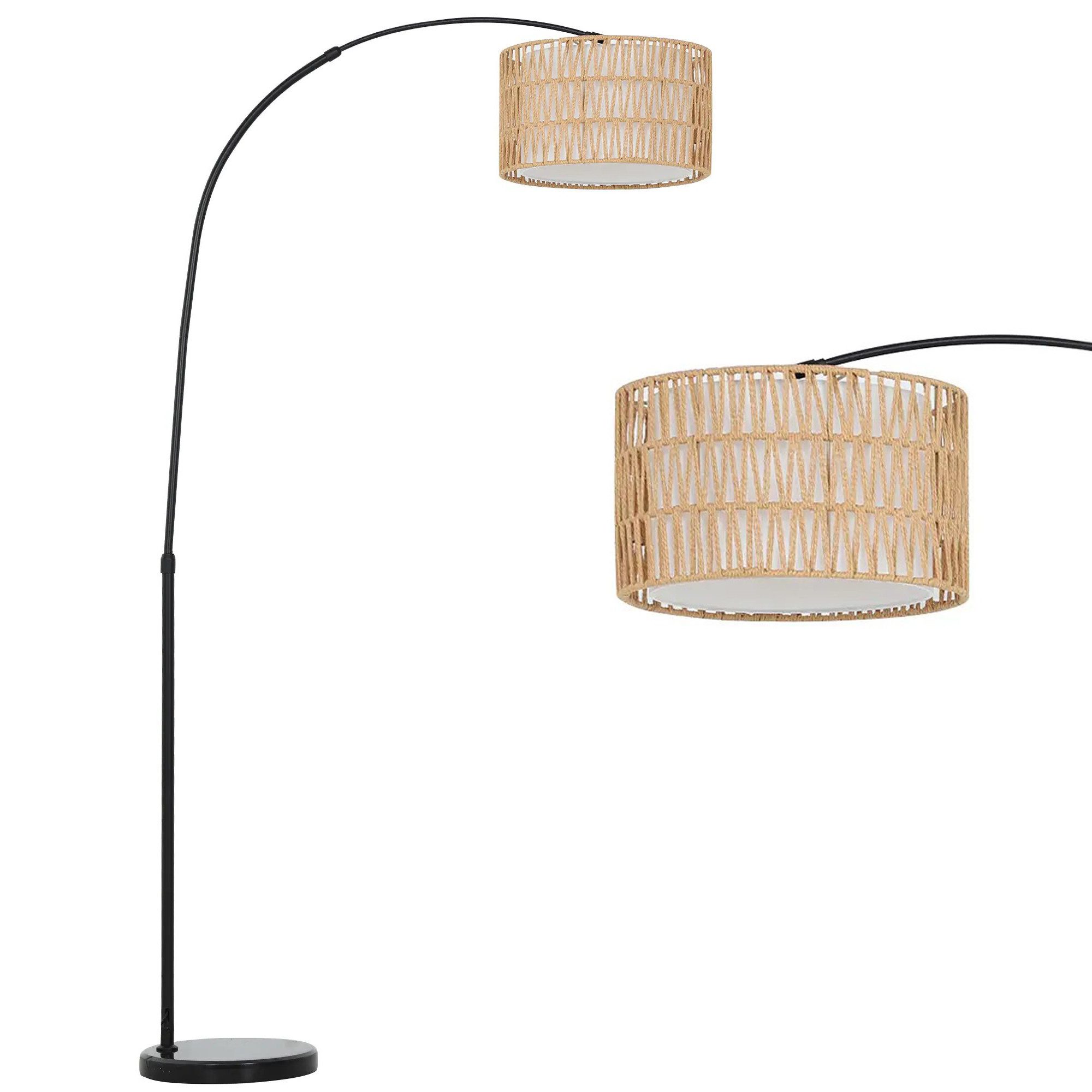 Diese stilvolle Stehlampe kombiniert traditionelle Inspiration mit modernem Design. Der zweischichtige Schirm aus Hanfseil und Metall erinnert an klassische Fischerlaternen und sorgt für ein warmes, gemütliches Lichtambiente. Das Zusammenspiel natürlicher Materialien mit einer stabilen Metall- und Marmorkonstruktion macht die Lampe zu einem dekorativen Highlight in jedem Raum.