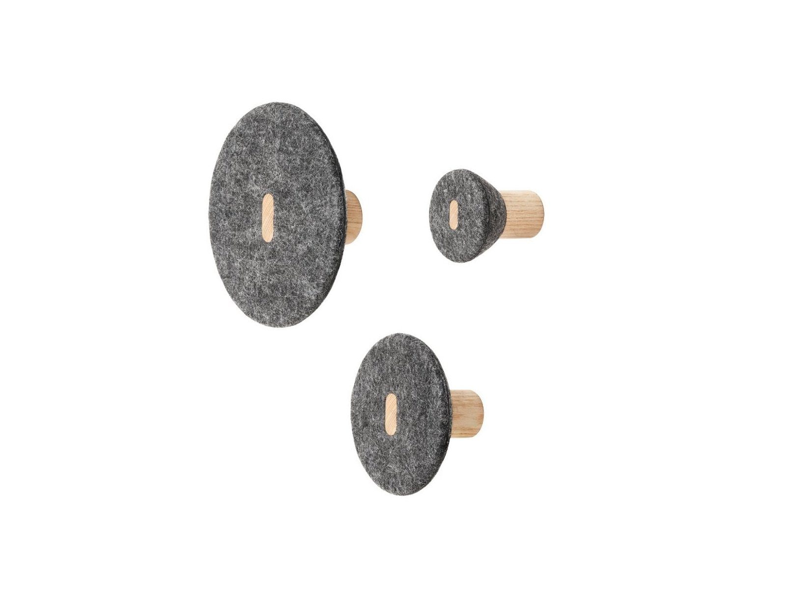 Das Designstudio kaschkasch hat die Wandhaken PELA von blomus entworfen. Die Haken aus den Natur-Materialien Filz und Holz sind geradezu prädestiniert Ihre Jacken, Schals und auch Taschen ordnungsgemäß hinhängen zu können. Natürlich können Sie auch Hüte über die dunkelgraue feste Filzscheibe leger drapieren und an der aus Hartholz hergestellten Distanzstange können Sie Kleiderbügel aufhängen.