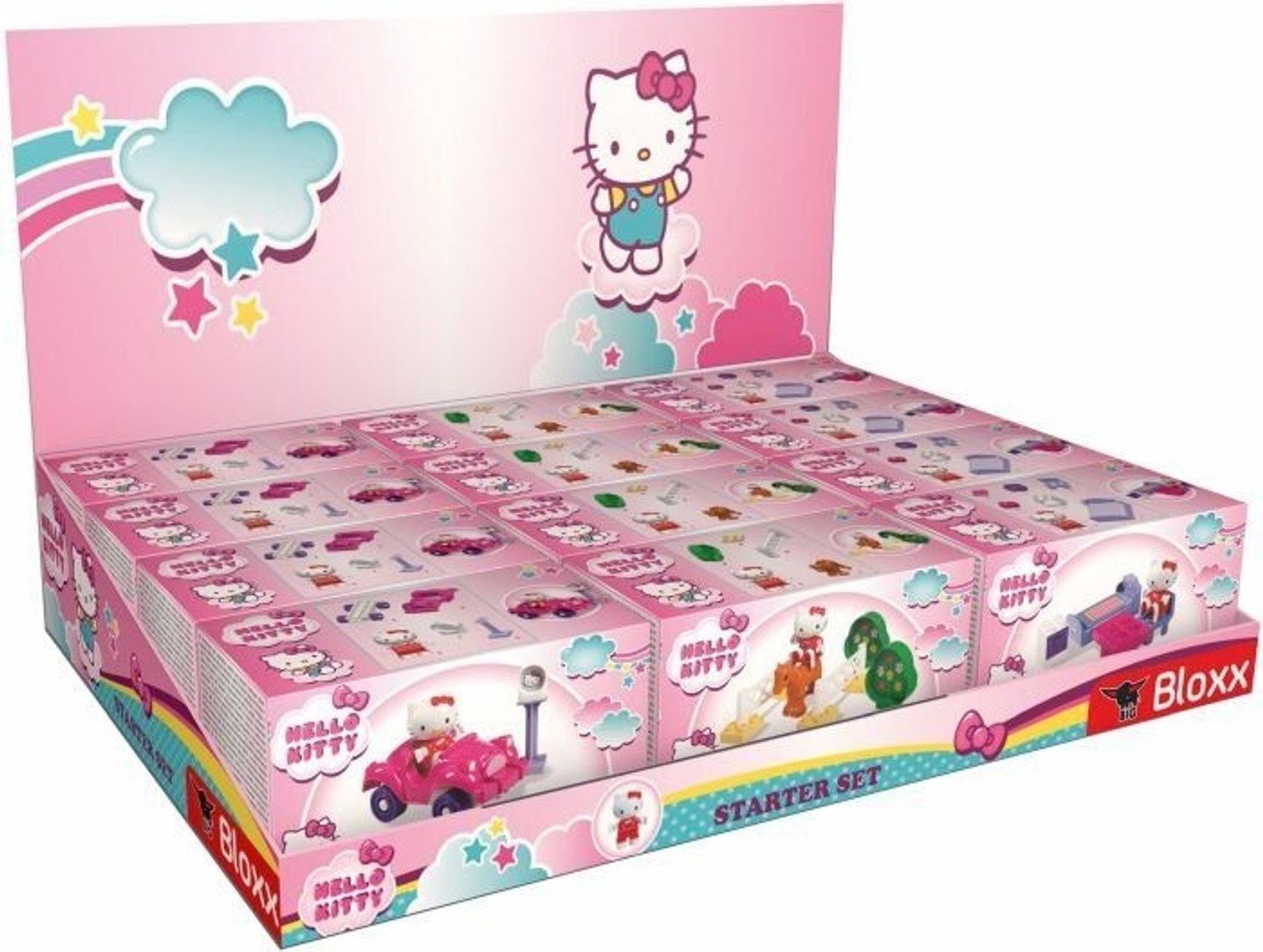 Die ganze Welt ist verrückt nach ihr und auch hierzulande hat die wohl berühmteste Japanerin Kultstatus: Hello Kitty, die Comic-Katze, begann ihre Karriere 1974 als Motiv auf einer Geldbörse. Der Kult-Charakter mit unzähligen kleinen Fans ist nun auch im Rahmen einer spielstarken BIG-Bloxx-Produktlinie zu finden. Zur Auswahl stehen bei den Starter Sets drei verschiedene Ausführungen, bei jedem der Sets ist eine Hello Kitty Figur enthalten. Hello Kitty und ihr Schlafzimmer ist ein Bausteinset mit 7 Teilen, darunter Stuhl, Tisch, Bett und Nachtschränkchen. Hello Kitty und ihr Auto besteht aus 5 Teilen, darunter ein niedliches Auto und eine Parkuhr. Das Set Hello Kitty auf dem Pferd ist 10-teilig und enthält ein Spielzeugpferdchen, Büsche und Zäune Die Spielsets bietet Kindern im Alter von 18 Monaten bis 5 Jahren jede Menge Spielspaß. Durch die farbenfrohen, detailgetreuen Teile und das beliebte Thema Hello Kitty ist für hohen Spielwert gesorgt. Die dreifache Sortierung kommt im 4C-bedruckten Display, das 12 Sets enthält, jeweils 4 von jeder Sorte. Die Bausteine sind mit bekannten Spielsteinen kompatibel. Durch den hochwertigen Kunststoff können sie leicht gereinigt werden. HELLO KITTY used under license. SANRIO GMBH. ©1976, 2020 SANRIO CO.LTD. All rights reserved.