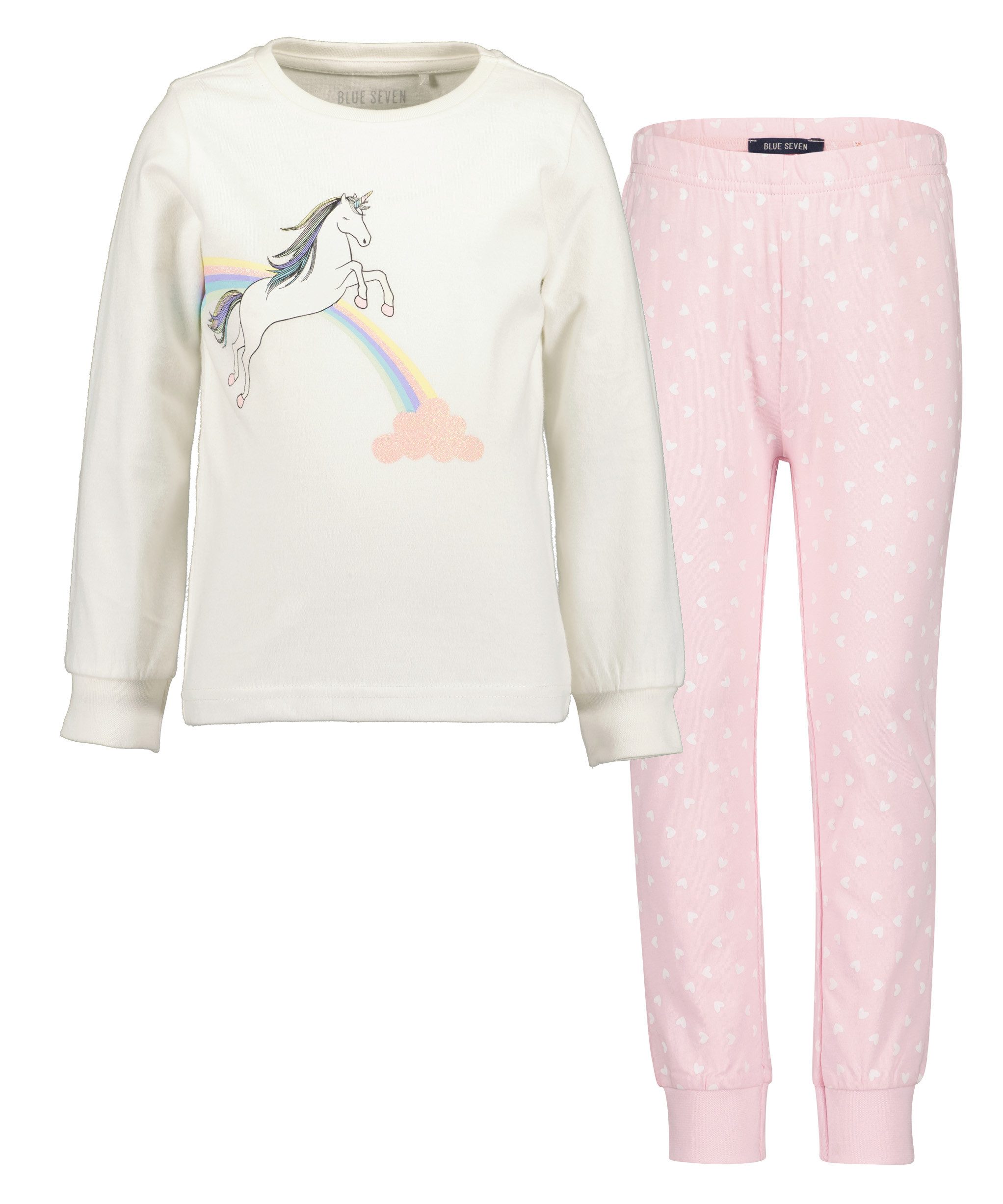 Der Tag war lang. Es wurde wild gespielt und getobt. Jetzt ist endlich die Zeit für Ruhe und Gemütlichkeit mit diesem zweiteiligen Mädchen-Pyjama von Blue Seven. Und damit die Kids auch im Kuschel-Modus extra-süß aussehen, ist er bei normaler Leibhöhe normal lang geschnitten. Dazu passt die abgesteppte Kante bei normaler Leibhöhe. Der Pyjama verfügt über einen Rundhalsausschnitt. Die Ärmel sind lang und haben ein Rippbündchen. Die schmal geschnittenen Hosenbeine finden in einem Rippbündchen zum Fuß hin ihren Abschluss. Den oberen Abschluss bildet ein elastischer Bund mit Gummizug.