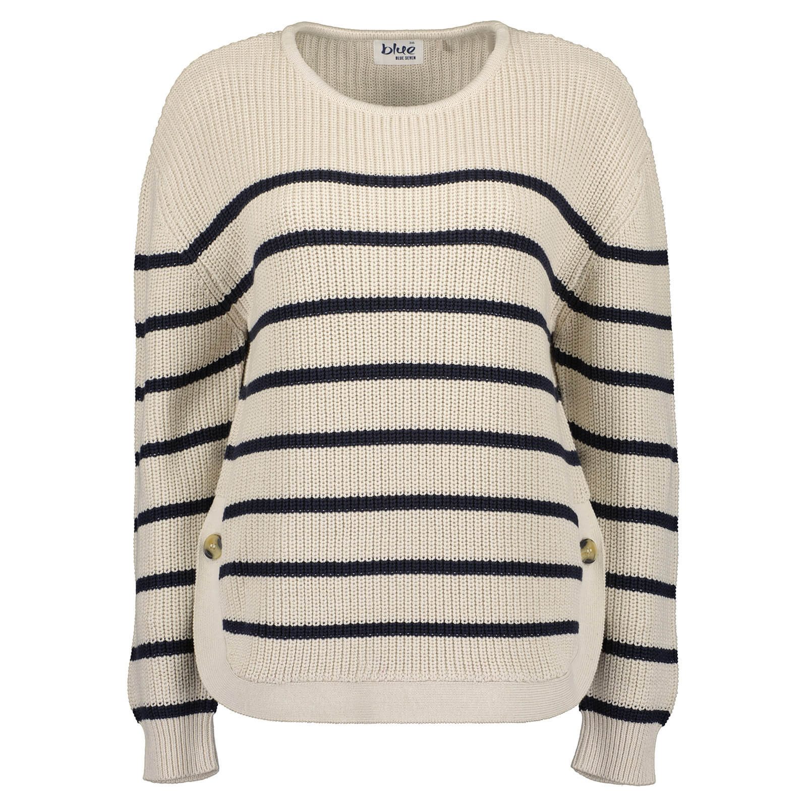 Der Strickpullover überzeugt mit seinem ansprechenden Streifen-Design, das zeitlose Eleganz ausstrahlt. Der klassische Rundhalsausschnitt sorgt für eine angenehme Passform und unterstreicht die feminine Silhouette. Der runde Saum mit dekorativen Knöpfen verleiht dem Pullover ein besonderes Detail, das ihn von gewöhnlichen Designs abhebt. Gefertigt im Halbpatent-Muster bietet der Pullover eine weiche Textur und hält Sie an kühlen Tagen angenehm warm. Die hochwertige Strickqualität sorgt für Langlebigkeit und hohen Tragekomfort, sodass Sie diesen Pullover immer wieder gerne tragen werden.