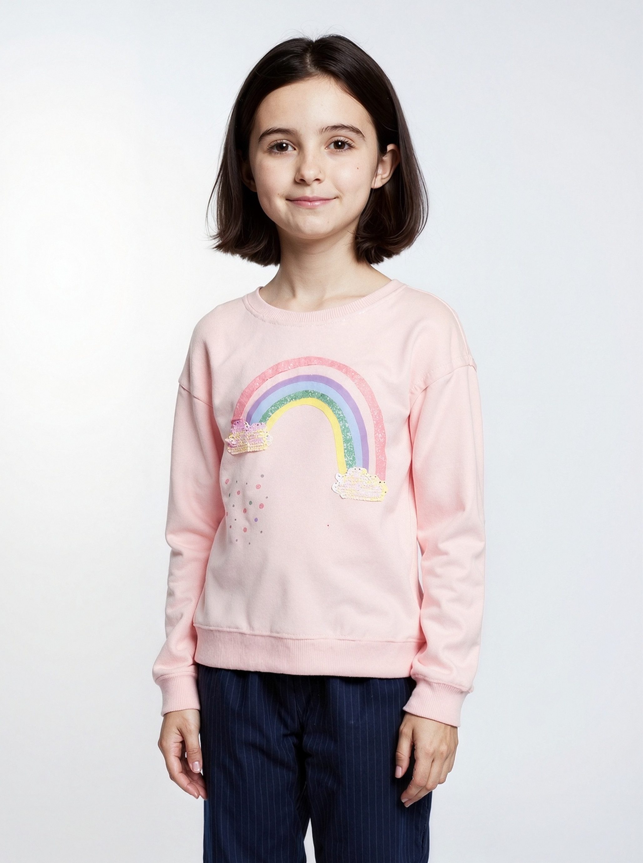 Das Sweatshirt zusammen mit Jeans und farbenfrohen Sneakern hält kuschelig warm und schränkt die Bewegungsfreiheit beim Toben auf dem Spielplatz nicht ein. Drunter kann ein Kleid mit Tüllrock getragen werden. Damit sieht das Outfit richtig süß aus.