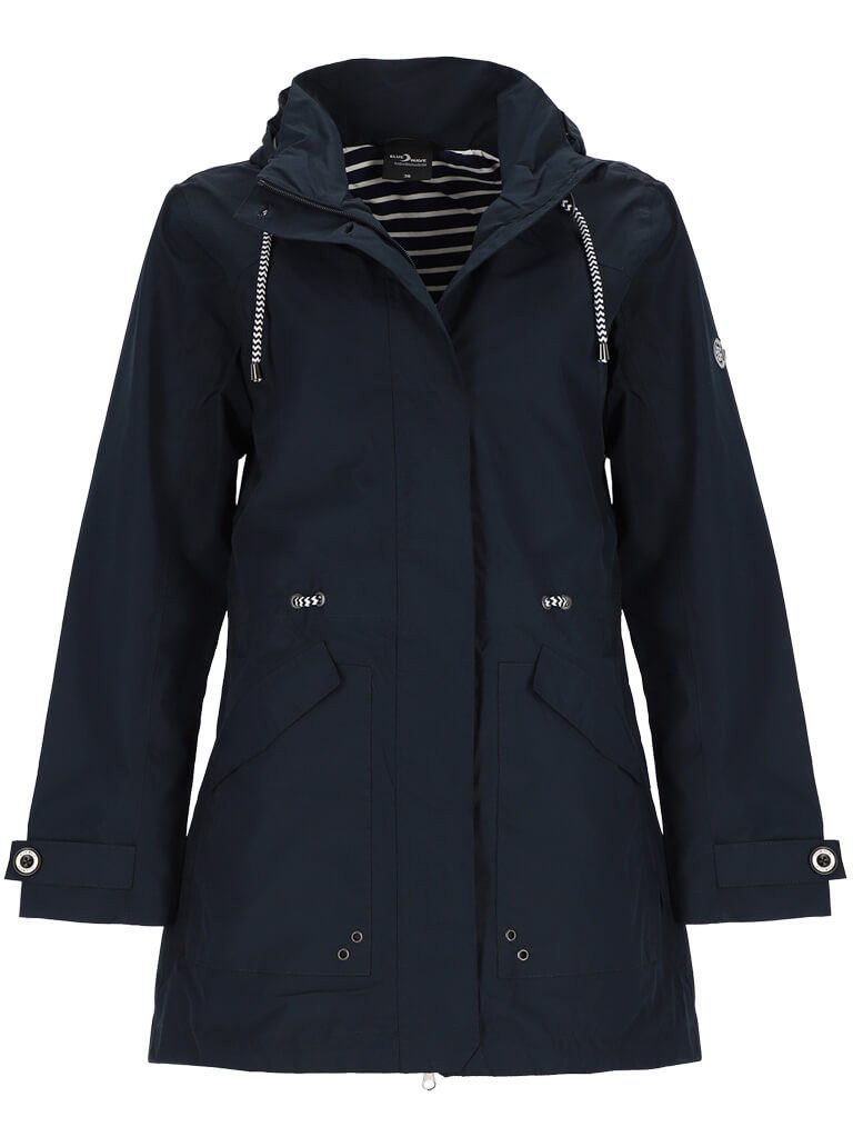 Mit einer Wassersäule von 10.000 mm und verschweißten Nähten ist der Parka wasserdicht, winddicht und atmungsaktiv, sodass Sie zuverlässig trocken und geschützt bleiben. Die Atmungsaktivität von 3.000 ml/qm/24h sorgt zudem für ein angenehmes Körperklima, indem Feuchtigkeit nach außen abgeleitet wird. Dank des Taillenzugs im Inneren lässt sich die Jacke individuell anpassen und betont die feminine Silhouette. Der Kordelzug am Bund bietet zusätzliche Variationsmöglichkeiten für die Passform. Das weiche Jersey-Innenfutter sorgt für extra Tragekomfort, während die abnehmbare und verstellbare Kapuze flexibel an Wetterverhältnisse angepasst werden kann. Für praktische Funktionalität sorgt der abgedeckte 2-Wege-Frontreißverschluss, der Bewegungsfreiheit und Schutz vor Wind bietet. Die aufgesetzten Taschen mit Patten bieten Platz für wichtige Kleinigkeiten, während eine Innentasche mit Reißverschluss zusätzlichen Stauraum für Wertsachen schafft. Die Dekorknöpfe am Ärmelbund verleihen der Jacke einen stilvollen Touch und unterstreichen das durchdachte Design. Mit ihren maritimen Details bringt diese Outdoor-Jacke einen modernen, sportlich-eleganten Look in Ihre Garderobe. Ob bei Spaziergängen an der Küste, in der Stadt oder auf Reisen – der Funktionsparka für Damen ist der ideale Begleiter für wechselhaftes Wetter.