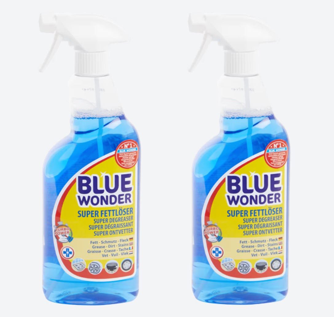 Blue Wonder Super Fettlöser 2 x 750 ml • Geeignet für die Entfettung verschiedener Produkte, z.B. Felgen, Grill oder Kochherd • Turbo Power, extra kraftvoller Fettlöser • Von der niederländischen Verbraucherorganisation als bester Reiniger bewertet Fett hat keine Chance, wenn man dieses Fettlösespray von Blue Wonder besitzt.