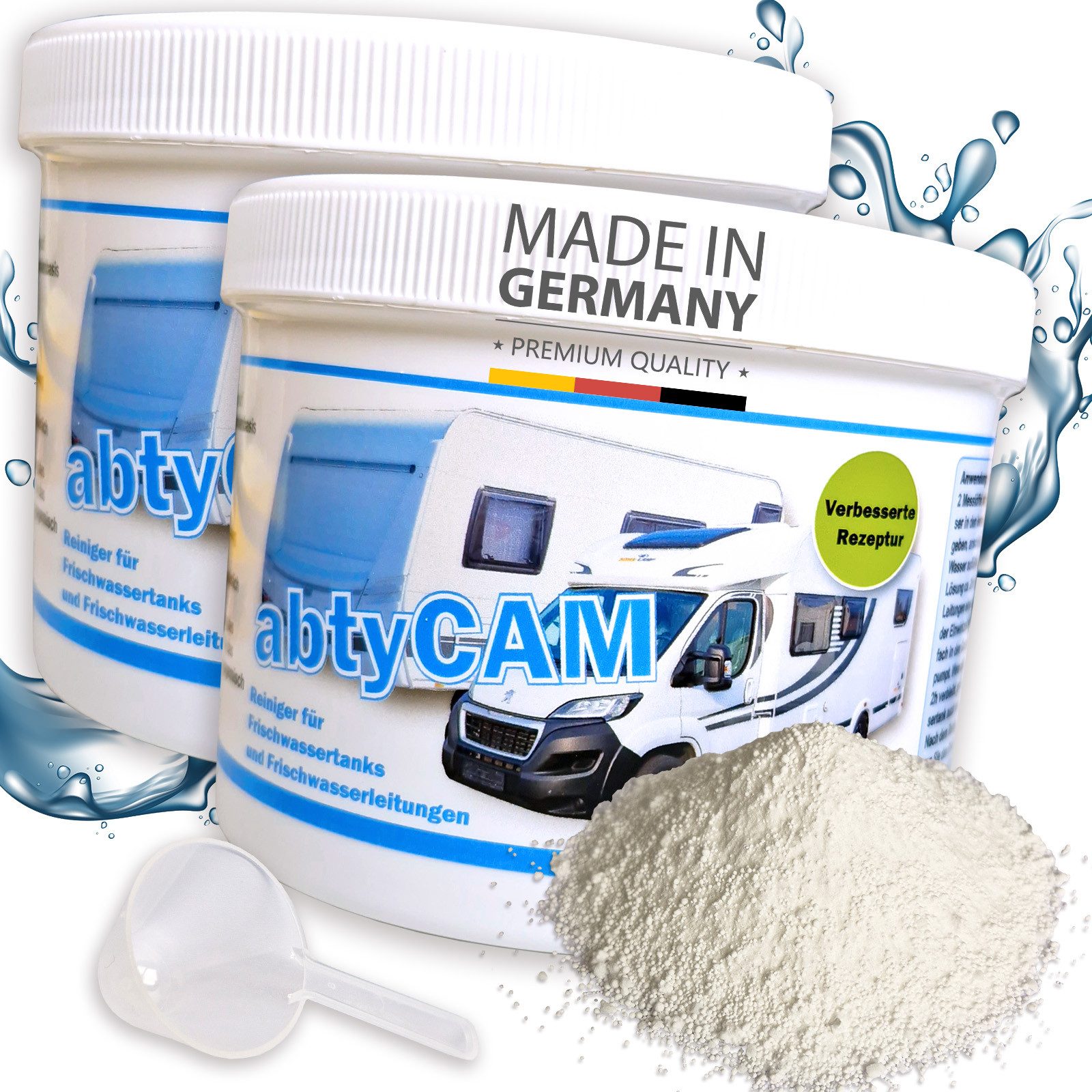 Anwendung: 2 Messlöffel abtyCAM pro 20 L Wasser in den leeren Frischwassertank geben, anschließend komplett mit Wasser auffüllen. Die entstehende Lösung ca. 2 Stunden im Tank und in den Leitungen einwirken lassen. Nach der Einwirkzeit wird die Lösung einfach in den Grauwassertank gepumpt. Wenn diese dort ebenfalls 2 Stunden verbleibt, profitiert Ihr Grauwassertank auch von der Reinigung. Nach dem Reinigungsprozess können Sie den Frischwassertank einfach wieder mit Trinkwasser befüllen.