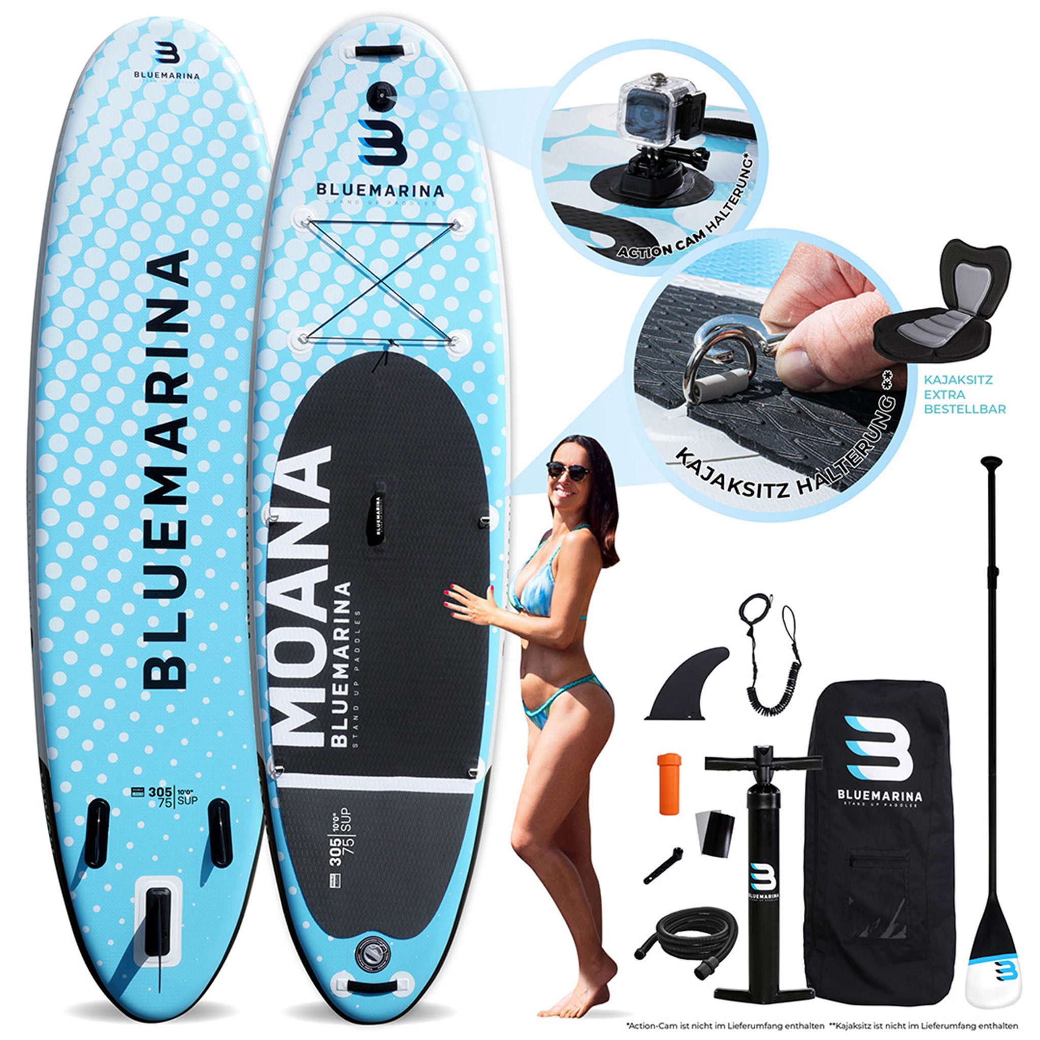 Mit dem Bluemarina Stand Up Paddle Board Moana 2022 sind Sie allzeit sicher unterwegs. Das hochwertige Double-Layer-Material und das spezielle Rocker-Profil machen das aufblasbare SUP zum äußerst ausdauernden Board und verleihen ihm maximale Stabilität.