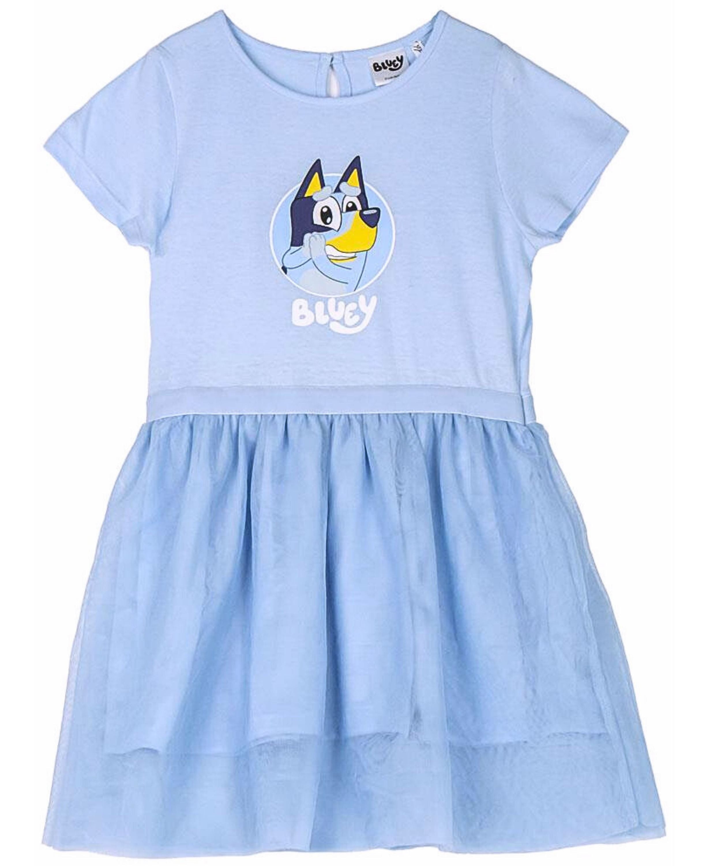 Das himmelblaue Jersey-Kleid von Bluey vereint Komfort und Eleganz. Mit dem charakteristischen Bluey-Druck und Logo am oberen Teil strahlt es pure Lebensfreude aus. Der leichte A-Linien-Rock, bestehend aus zwei Lagen Tüll, verleiht diesem Kleid einen verspielten Touch. Die kurzen Ärmel und der praktische Knopf am Rücken machen es nicht nur zauberhaft, sondern auch kinderleicht anzuziehen.