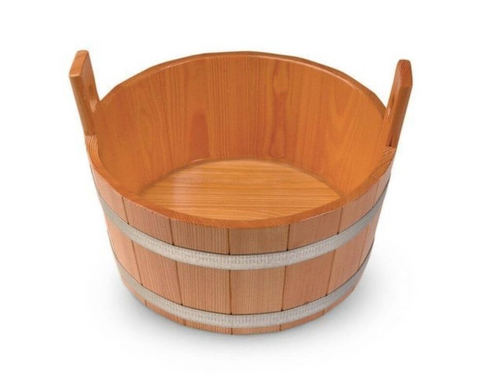 Der Fußwannenbottich ist mit zwei verlängerten Dauben ausgestattet, die als praktische Griffe dienen. Eine transparente Hygieneversiegelung, sowohl innen als auch außen, sorgt für eine nahezu feuchteundurchlässige Oberfläche. Zwei verzinkte Metallreifen halten die Wanne stabil zusammen.