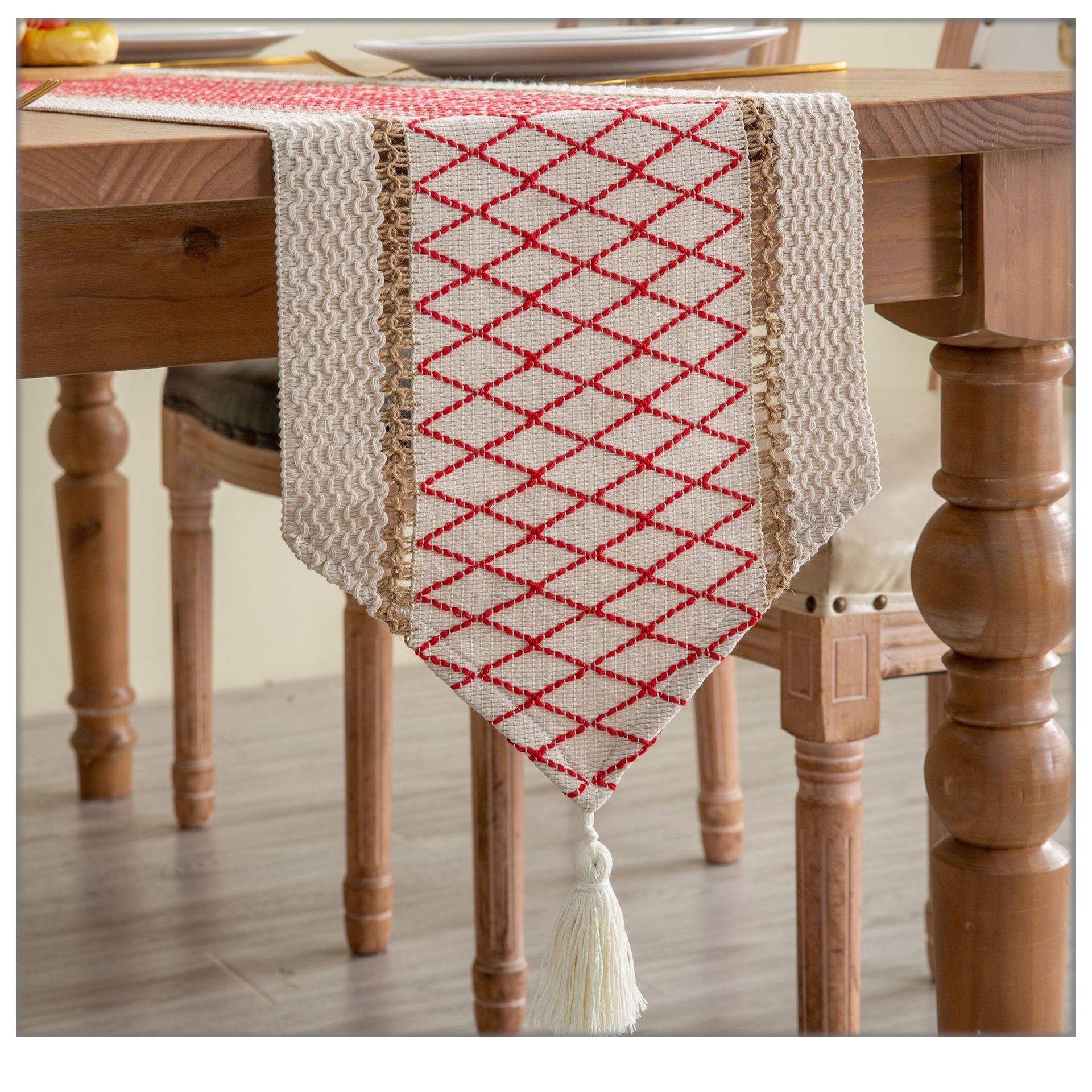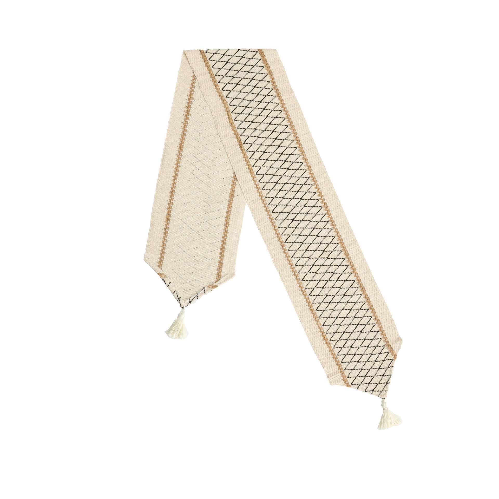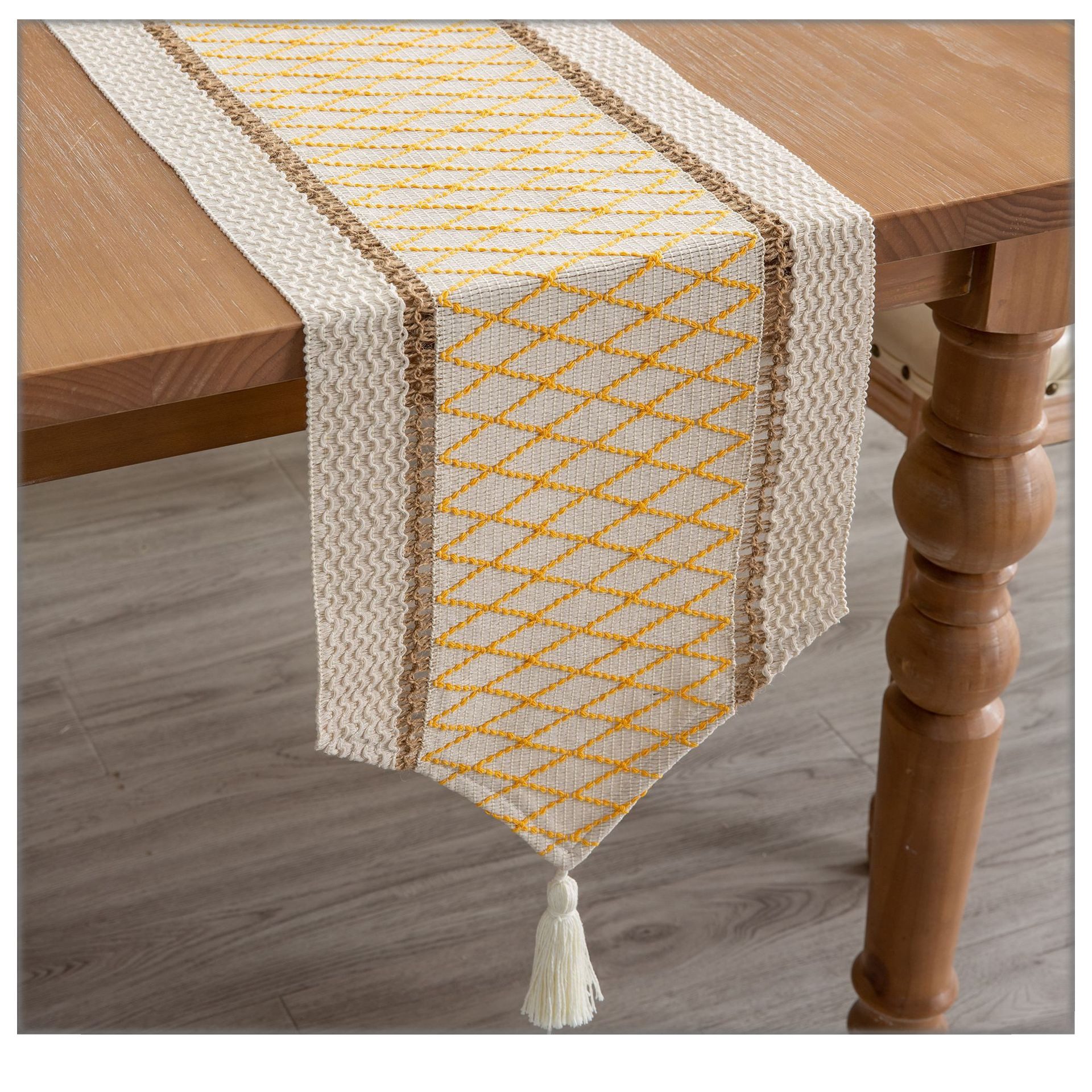 Der zweifarbige Tischläufer aus gewebtem Netzgewebe aus Baumwolle und Leinen trifft auf die spitzen Quasten im Bohème-Stil und bringt eine lebendige, festliche Atmosphäre in Ihr Zuhause. Mehrere Größen eignen sich für unterschiedliche Szenen, um eine stimmungsvolle Esstischästhetik zu schaffen.