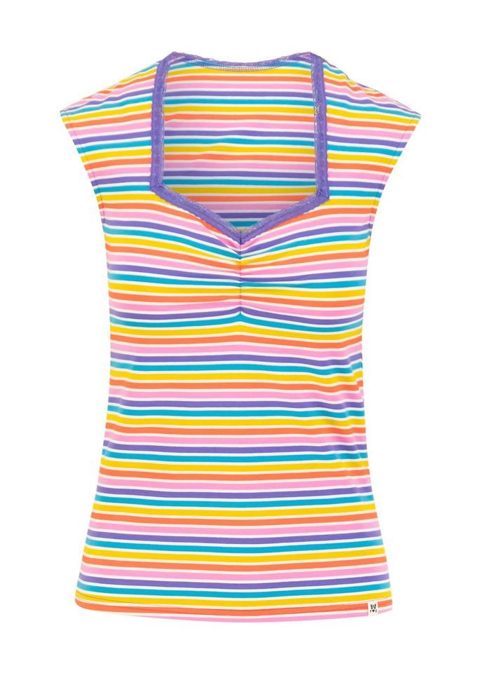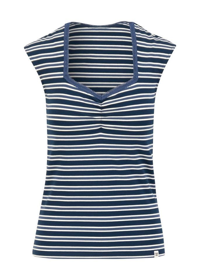 - Das enganliegende Blutsgeschwister Sommer Top mit Ringel-Design, herzförmigem Carré-Ausschnitt und raffinierten Details bietet femininen Stil und angenehmen Tragekomfort – perfekt für warme Tage.