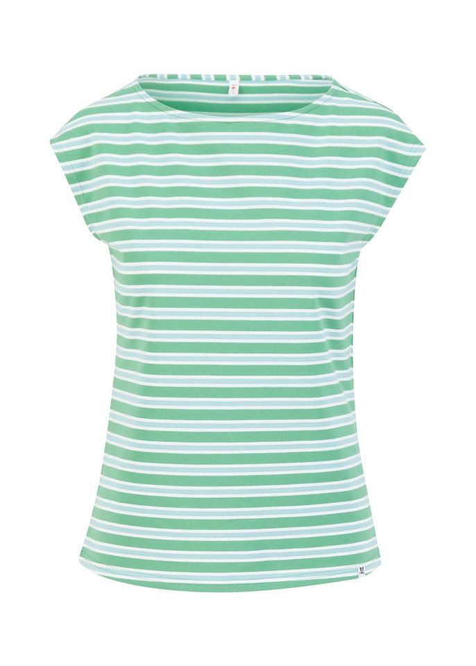 Das Blutsgeschwister Sommer Top mit U-Boot-Ausschnitt, lockerer Passform und gestreiftem Design in sommerlichen Farben bietet maximalen Komfort und lässigen Chic – perfekt für warme Tage.