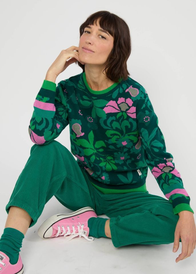 Cosy Storyteller – nachhaltiger Strickpullover aus Bio-Baumwolle & TENCEL™. Jacquardmuster, Rundhalsausschnitt & Rippenbündchen. Perfekt für Herbst & Winter.