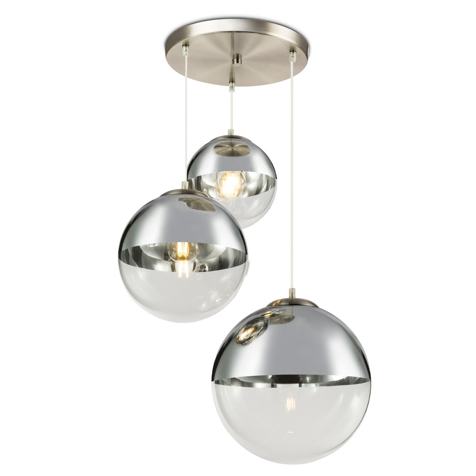 Wissenswertes | HÄNGELEUCHTE – MODERN – GLASKUGELN Diese moderne Pendelleuchte überzeugt mit ihrer wunderschönen Optik. Der Durchmesser des runden Deckenelements beträgt 51cm, daran befinden sich drei verschieden große Glaskugeln. Im oberen Teil ist die Glaskugel nickelmatt. Durch ihr Design wird sie garantiert zu einem Blickfang in jedem Wohnzimmer oder Schlafzimmer. Dank drei E27-Fassungen, haben Sie die Möglichkeit das Leuchtmittel bis max. 40 Watt zu bestimmen. Je nachdem welche Lichtfarbe und Lichtstärke Sie gerne hätten. Wir empfehlen Ihnen LED-Lampen, wegen ihrer Langlebigkeit und Stromersparnis. Sie können die Pendelleuchte sehr gut mit anderen Artikel dieser Serie kombinieren. |